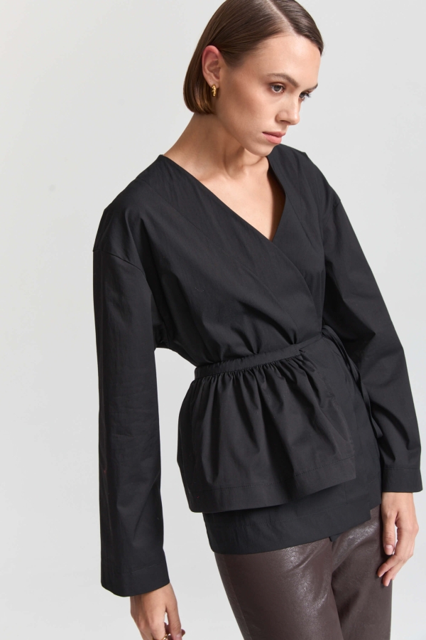 Женственная блуза для любого случая из хлопкового полотна. Блуза на запахе со сьемным декоративным поясом со сборкой из основной ткани. Рукав спущенный. Потайная петля и пуговица сбоку для фиксации борта.