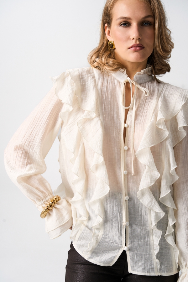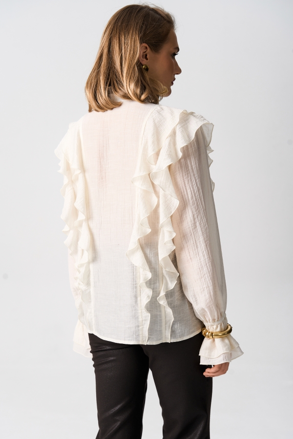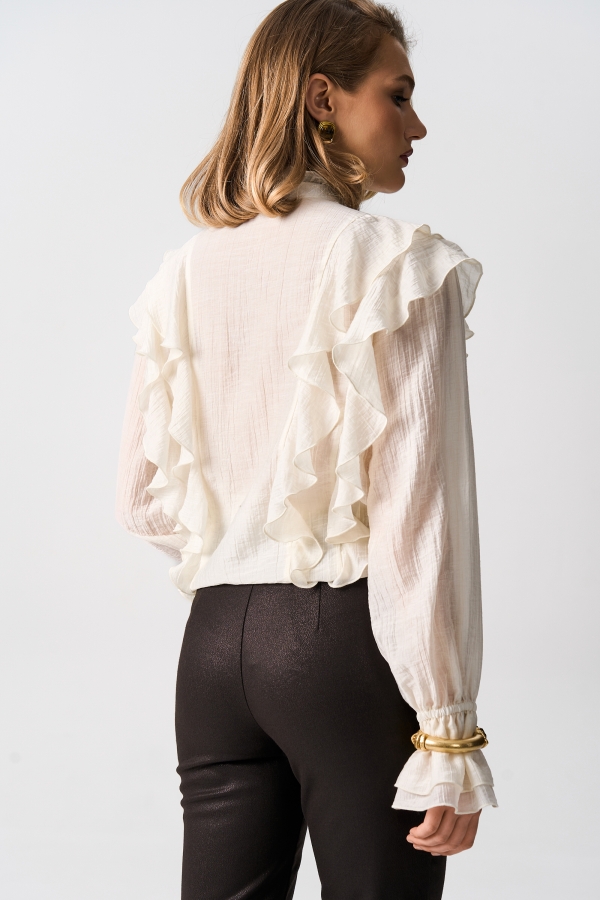 Модель свободного силуэта. По переду и спинке воланы. Застежка на воздушные петли и пуговицы. Воротник стойка с рюшей и завязками. Рукав втачной объемный с двойной манжетой на резинку.