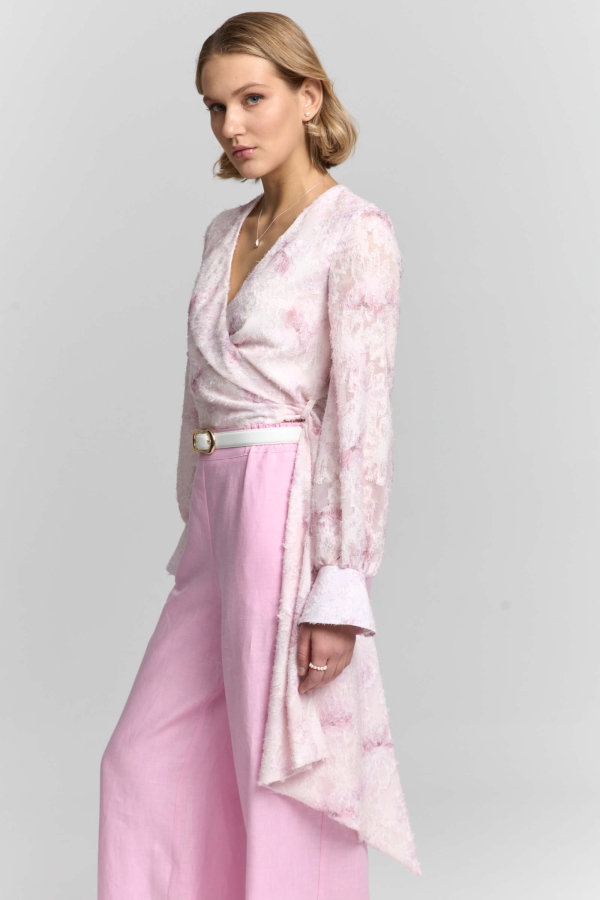 Блуза на запах из воздушного шифона с объемной вышивкой. Модель полуприлегающего силуэта на запах. По переду декоративный шлейф из шарфа. Рукав втачной,объемный по низу собран и фиксируется на манжету с пуговицей. Изделие по переду и спинке на подкладе.