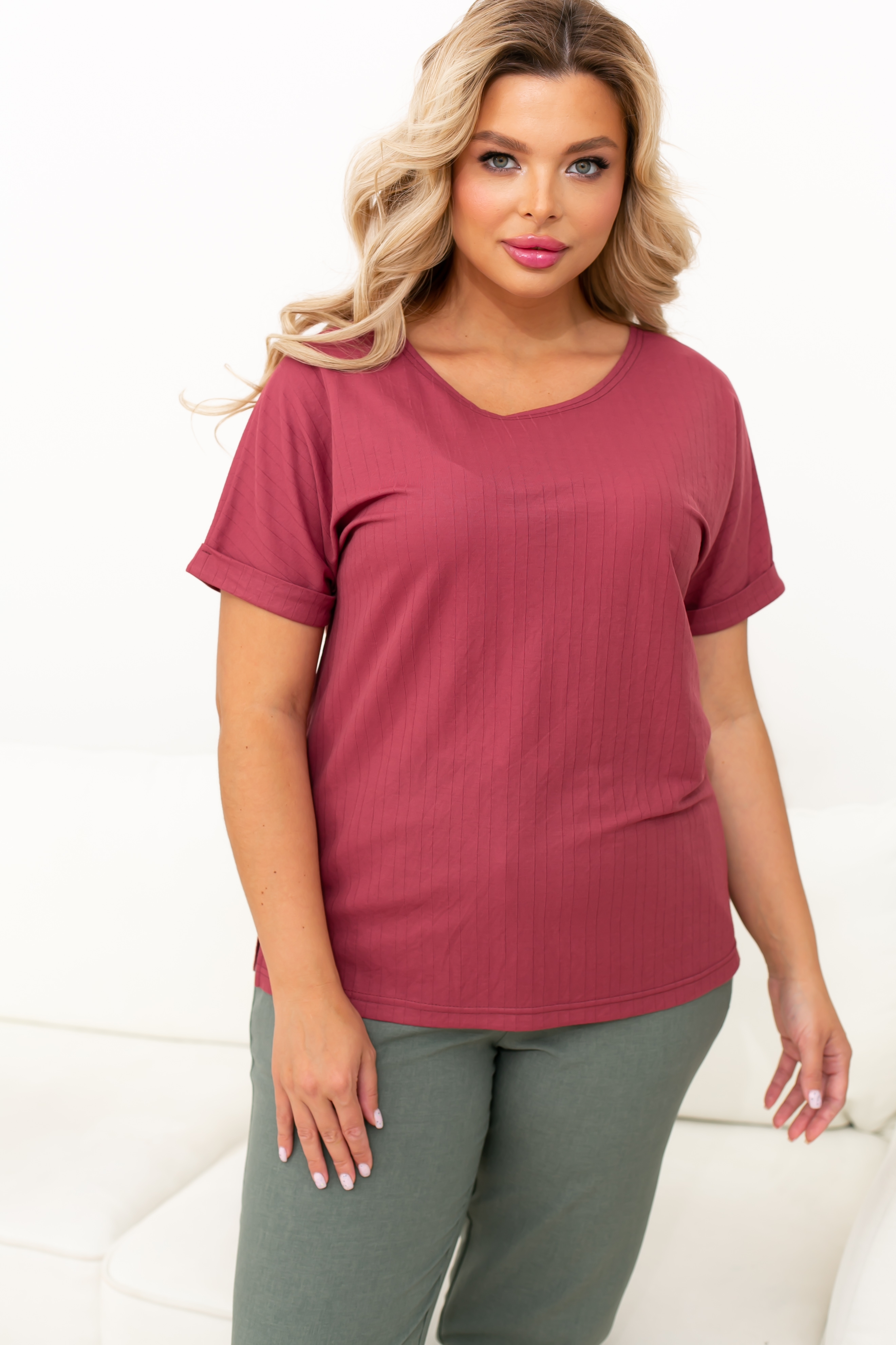 Практичная футболка прямого силуэта из мягкого трикотажа. Короткие цельнокроеные рукава, оканчиваются манжетами на отворотах. Округлый вырез горловины. Низ ровный, по бокам небольшие разрезы. Без застежки. Идеальный вариант на каждый день.