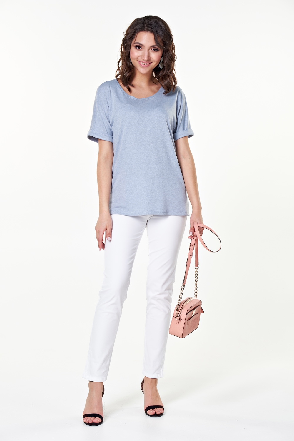 Красивая футболка прямого силуэта из однотонного мягкого трикотажа. Короткие цельнокроеные рукава, оканчиваются манжетами на отворотах. Округлый вырез горловины. Низ ровный, по бокам небольшие разрезы. Без застежки. Идеальный вариант на каждый день.Если не любите вещи свободные,лучше заказать на размер меньше.