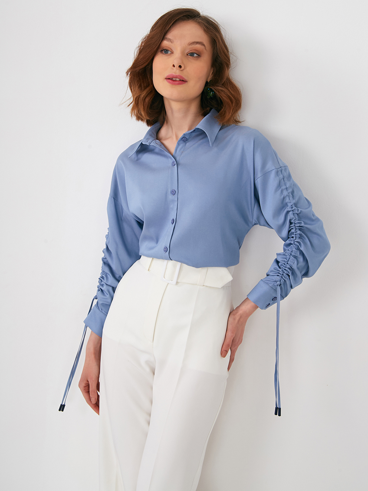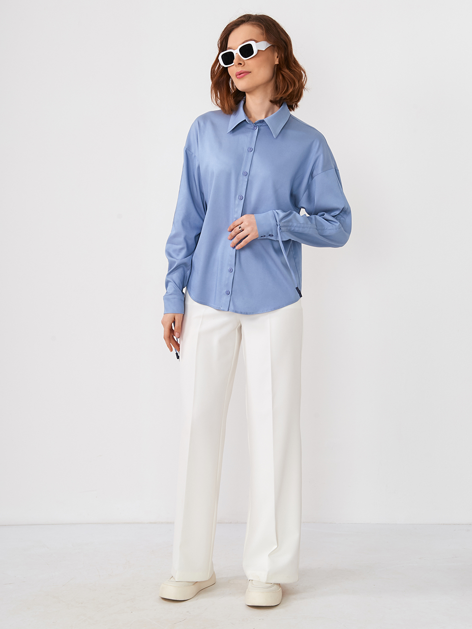 Блузка из однотонной тонкой джинсы. Прямой силуэт, спущенная линия плеча. Рубашечный воротник на стойке и планке. Рукав втачной, длинный, с регулируемой кулисой на завязках и манжете. Застежка на петли и пуговицы. Рост модели 170 см. Изделие на модели 42 р-ра. Длина изделия по спинке 63,5 см.