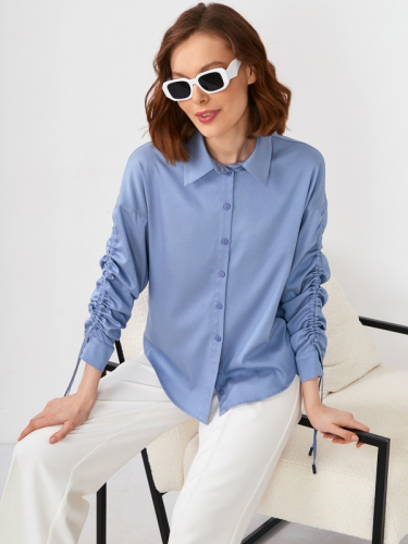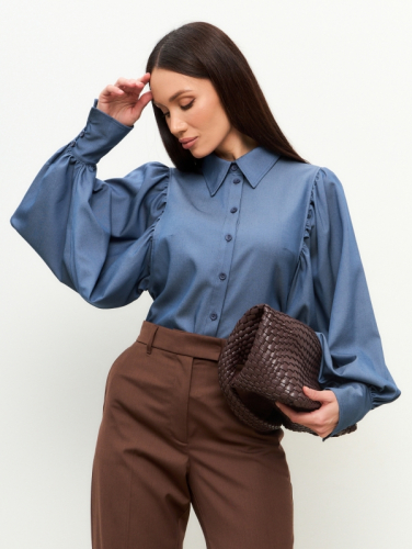 Блузка из однотонной тонкой джинсы. Прямой силуэт, спущенная линия плеча. Рубашечный воротник на стойке и планке. Рукав втачной, длинный, с регулируемой кулисой на завязках и манжете. Застежка на петли и пуговицы. Рост модели 170 см. Изделие на модели 42 р-ра. Длина изделия по спинке 63,5 см.