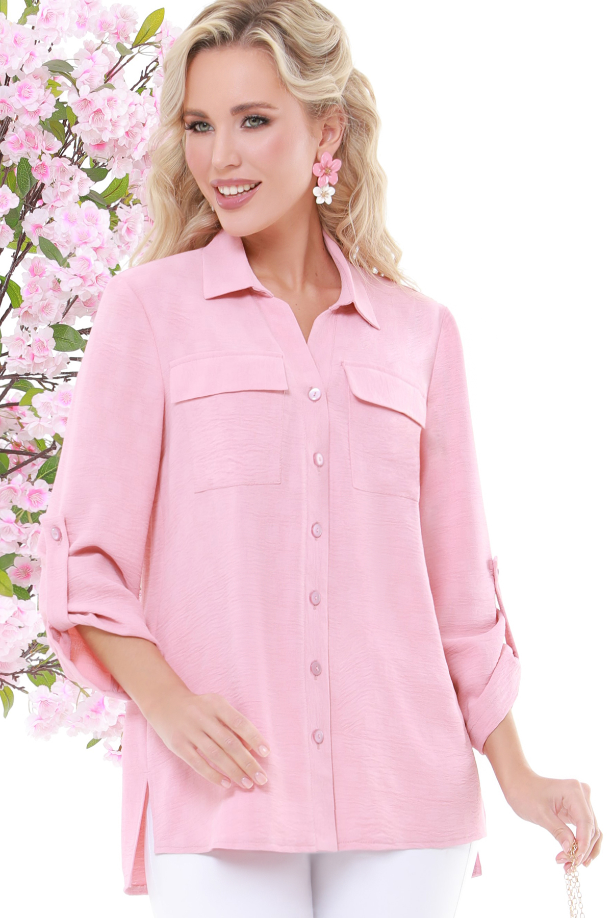 :Базовая блузка на пуговицах с карманами — основа гардероба, благодаря которой можно составить стильные и элегантные образы на все случаи жизни. Свободный прямой силуэт со слегка удлиненной спинкой и разрезами по бокам не подчеркивает нюансы фигуры и позволяет чувствовать себя комфортно. Особый шарм и утонченность придают блузке рукава ¾, собранные патами. Два нагрудных кармана функциональны и добавляют образу расслабленные нотки. Стильную блузку можно носить как навыпуск, так и заправленной полностью или только спереди, чтобы создать акцент на талии и визуально удлинить ноги. А сочетать модель с другими элементами гардероба не составит труда. Универсальная блузка прекрасно смотрится в паре с джинсами, брюками и юбками различных фасонов. Рекомендуется стирать изделие в бережном режиме без отжима.