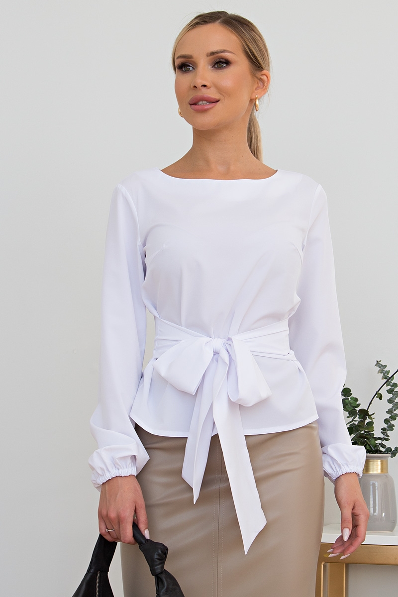 Элегантная  блузка приталенного силуэта из лёгкой ткани Ниагара. Округлая горловина на внутренней обтачке. Длинный втачной рукав присобран на эластичную резинку. Модель дополняет притачной пояс, который можно повязать в элегантный бант и подчеркнуть линию талии. Низ ровный, без разрезов.