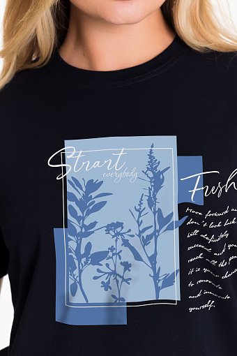 Женская футболка с принтом изготовлена из хлопкового полотна с добавлением лайкры, что обеспечивает комфорт и хорошую воздухопроницаемость. Футболка имеет короткий рукав и круглый вырез горловины, что придает ей классический стильный вид. Такая модель футболки отлично сочетается с джинсами, брюками или юбкой. Изготовленная из натуральной ткани, футболка обеспечит комфорт в течение всего дня.