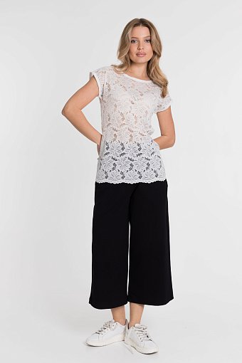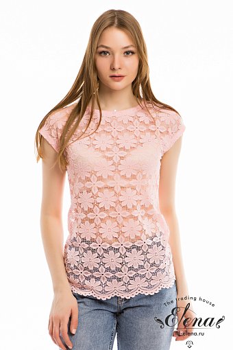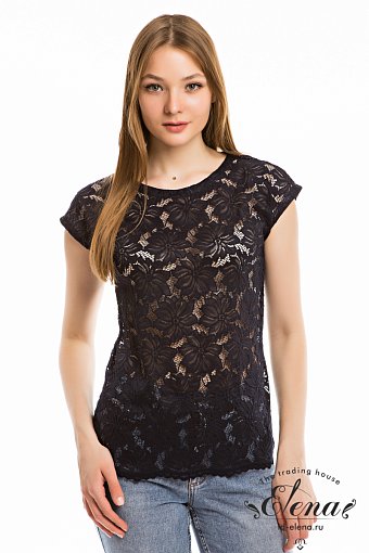 Футболка выполнена из кружева различных расцветок. Горловина с круглым вырезом, короткий цельнокроеный рукав.