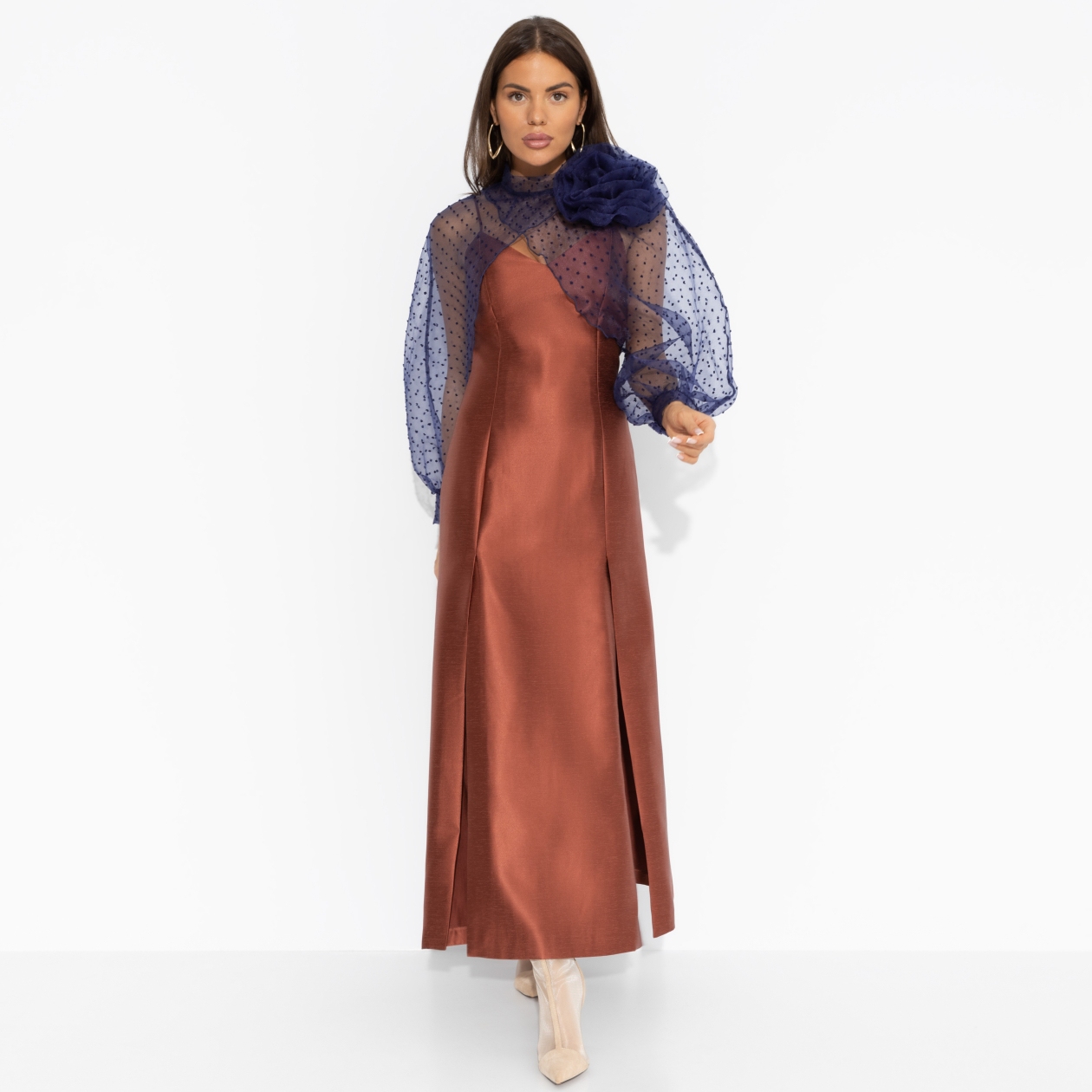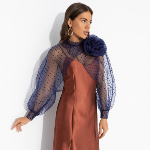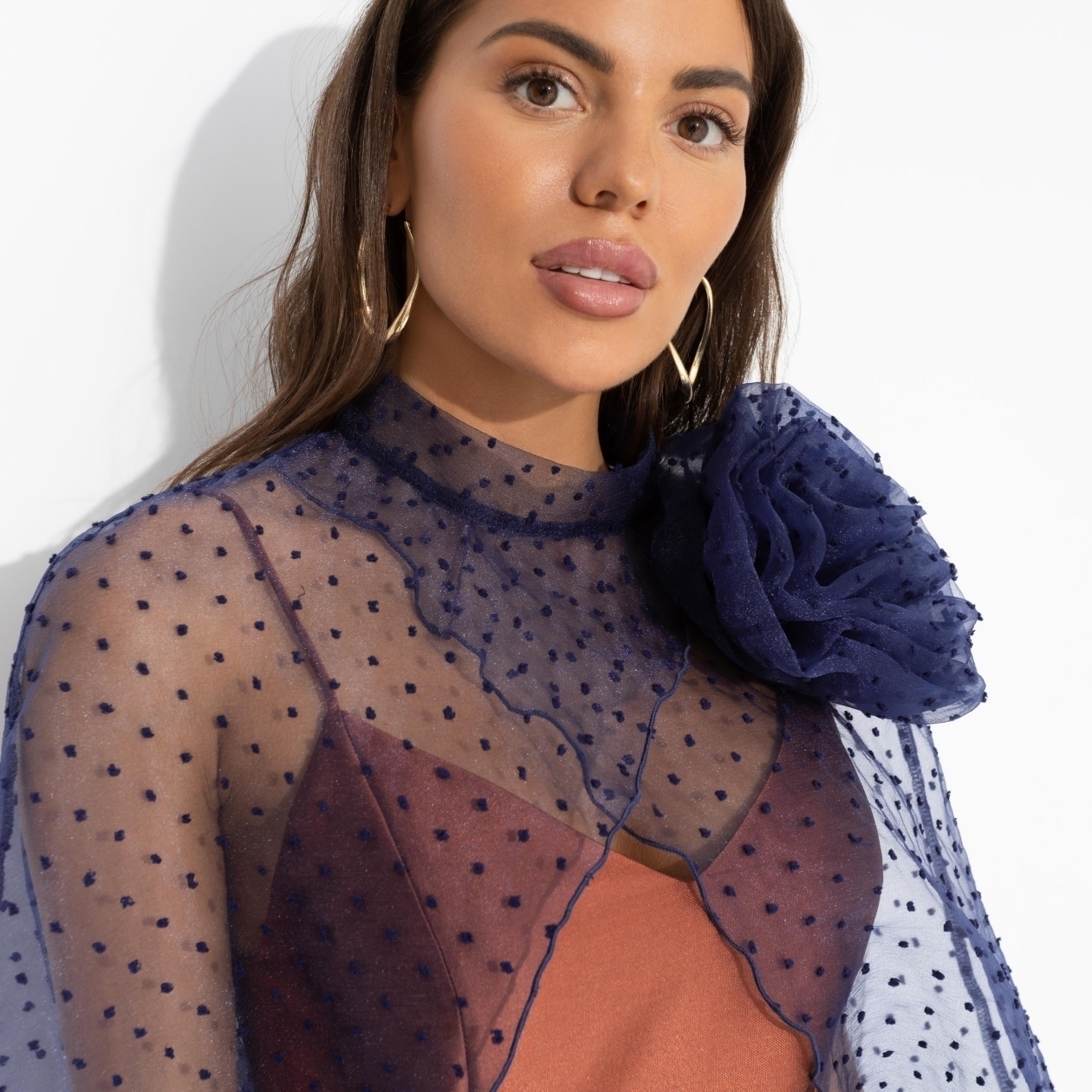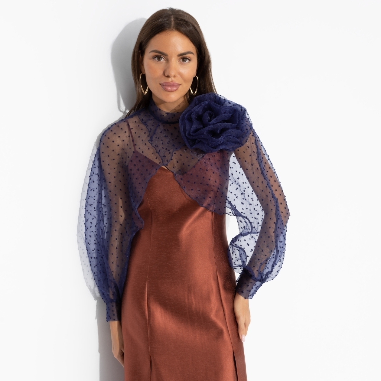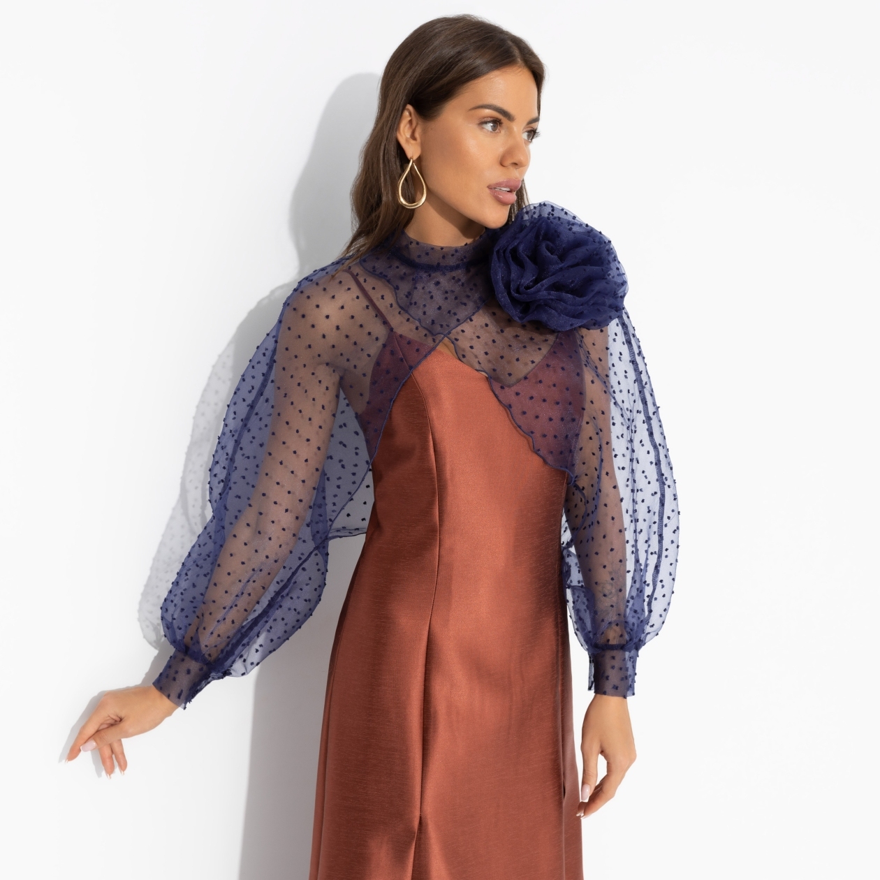 Вы договорились пойти в театр после работы. Нужно было видеть его лицо, когда ты достала из сумочки болеро ЧАРУТТИ и быстро надела. Ты выбрала быть нарядной в театре и сэкономила вам время, чтобы выпить аперитив перед постановкой. Болеро прозрачное, брошь-роза съемная. Деликатная пуговица в тон изделия сзади.