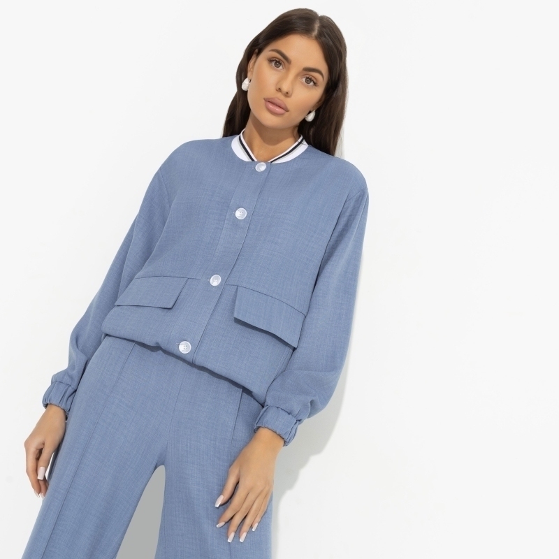 Бомбер CHARUTTI в голубом оттенке вполне может стать фирменной одеждой для охотниц за голубыми мечтами. Всех объединяет неустанное стремление к прекрасному, жажда жизни и высокий стиль. Бомбер свободного кроя. Застегивается пуговицы. Изделие с имитацией накладных карманов по передней части. Подол и ворот изделия оформлены трикотажной резинкой. Рукава также оформлены широкой скрытой резинкой.