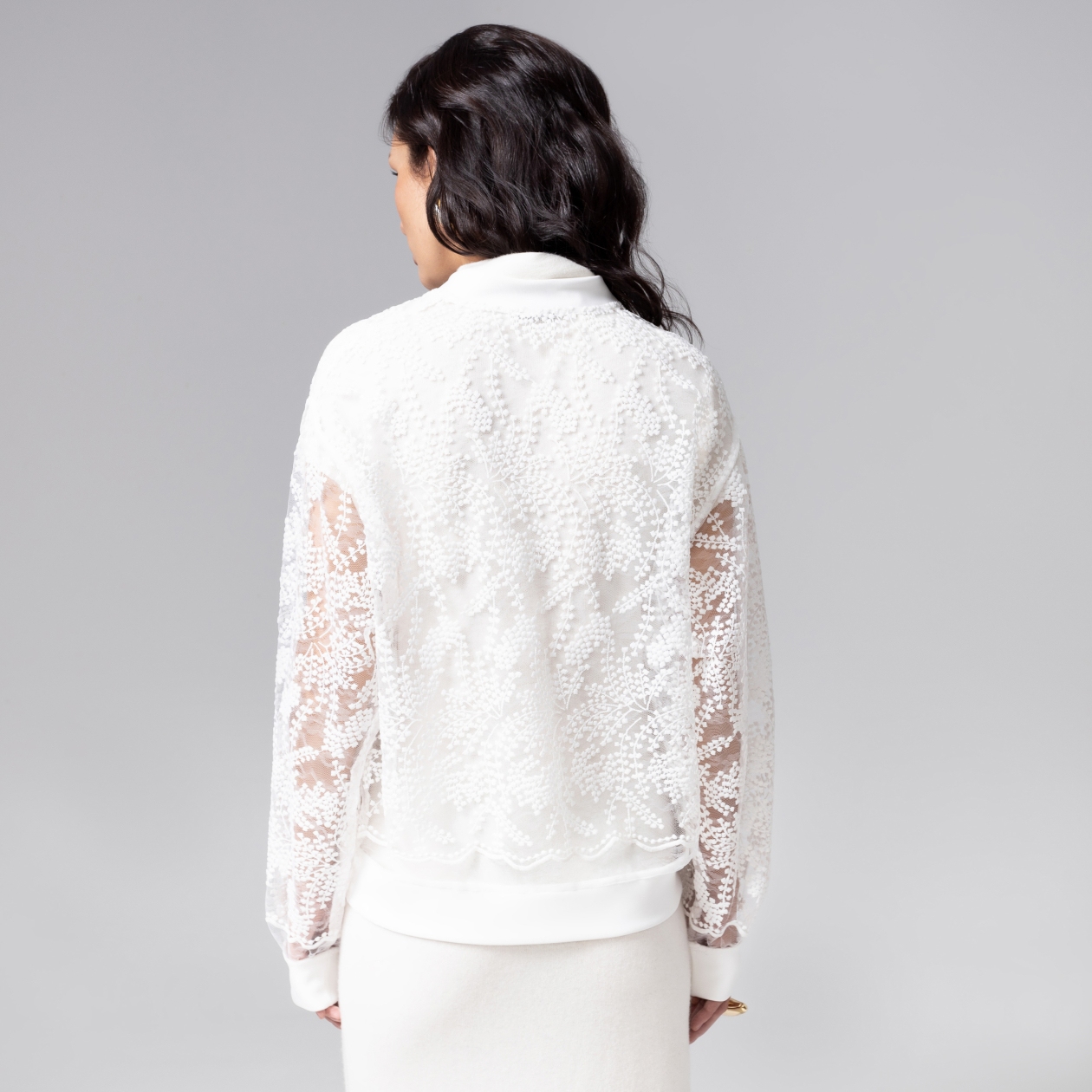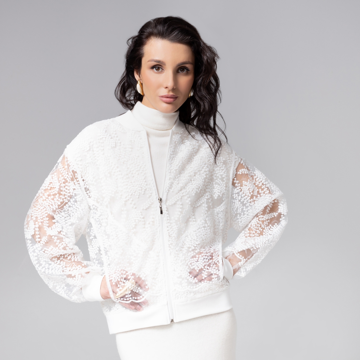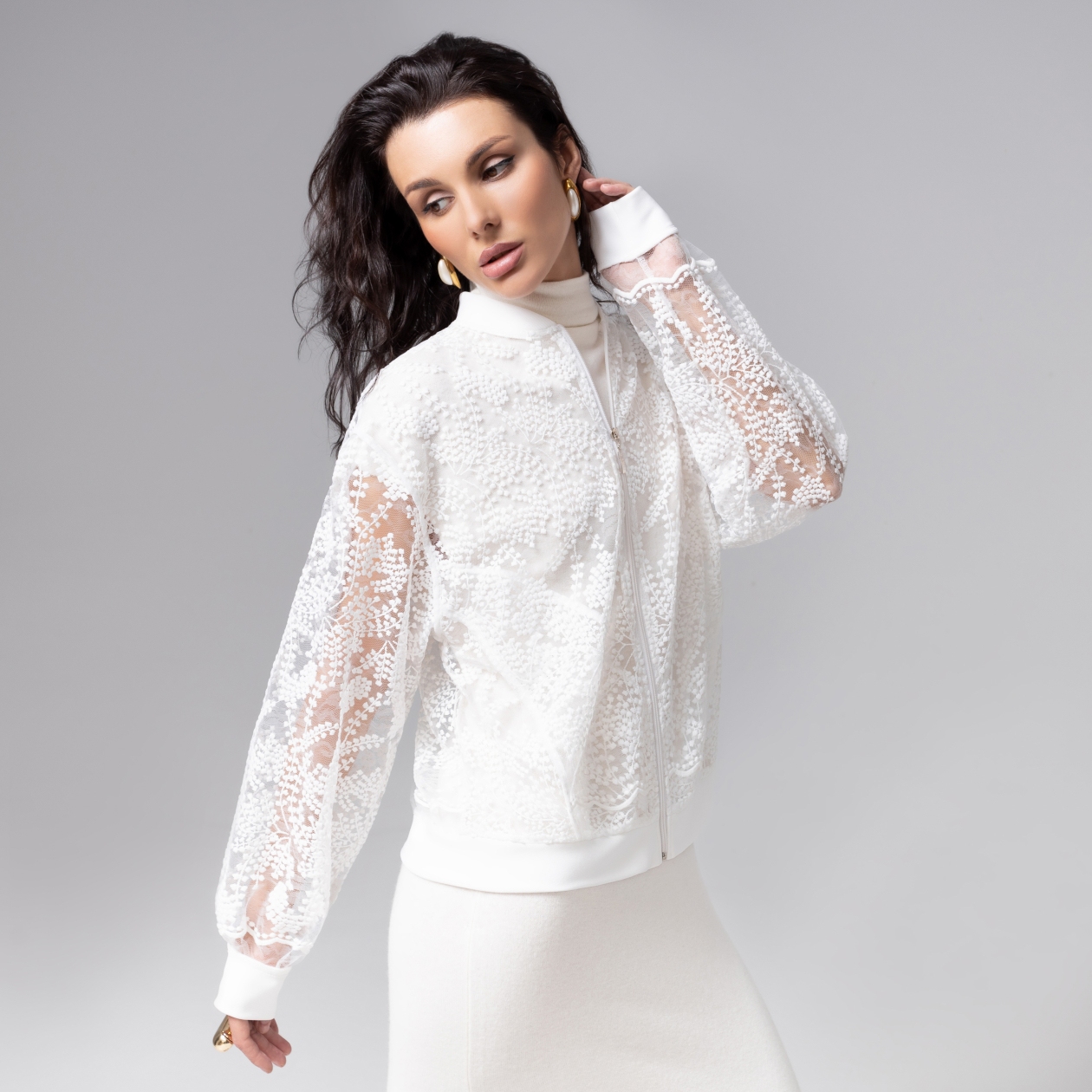 Женский бомбер ЧАРУТТИ из тончайшего кружева премиального качества, представляет собой воплощение утонченной контрастности. Современный крой встречается с изысканной деликатностью материала. Безупречная техника пошива подчеркивается идеальными, практически невидимыми швами, которые не нарушают ажурную структуру. Ювелирная работа. Изделие с карманами, просвечивет.