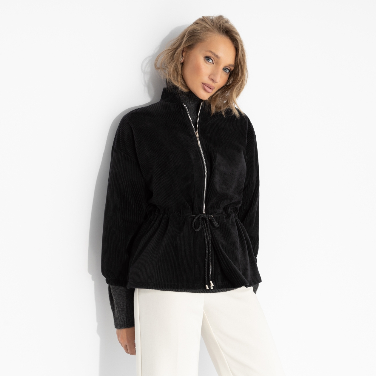 Фактурный бомбер сочетает мягкость и силу. Лаконичный чёрный, акцент на линии талии, блеск молнии – детали делают образ завершённым. Ты выбираешь – а мир подстраивается. Бомбер выполнен из мягкого трикотажа «велюр» с бархатистой поверхностью, которая красиво отражает свет и сохраняет форму. Центральная молния придаёт модели современный ритм, а регулируемая кулиска на талии позволяет варьировать силуэт от свободного до подчеркнуто женственного.