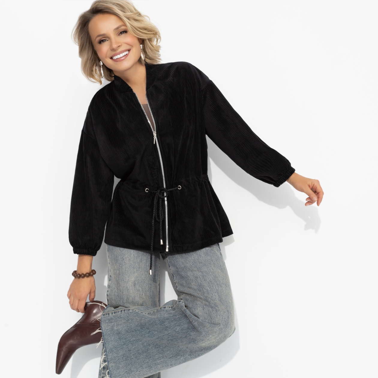 Фактурный бомбер сочетает мягкость и силу. Лаконичный чёрный, акцент на линии талии, блеск молнии – детали делают образ завершённым. Ты выбираешь – а мир подстраивается. Бомбер выполнен из мягкого трикотажа «велюр» с бархатистой поверхностью, которая красиво отражает свет и сохраняет форму. Центральная молния придаёт модели современный ритм, а регулируемая кулиска на талии позволяет варьировать силуэт от свободного до подчеркнуто женственного.