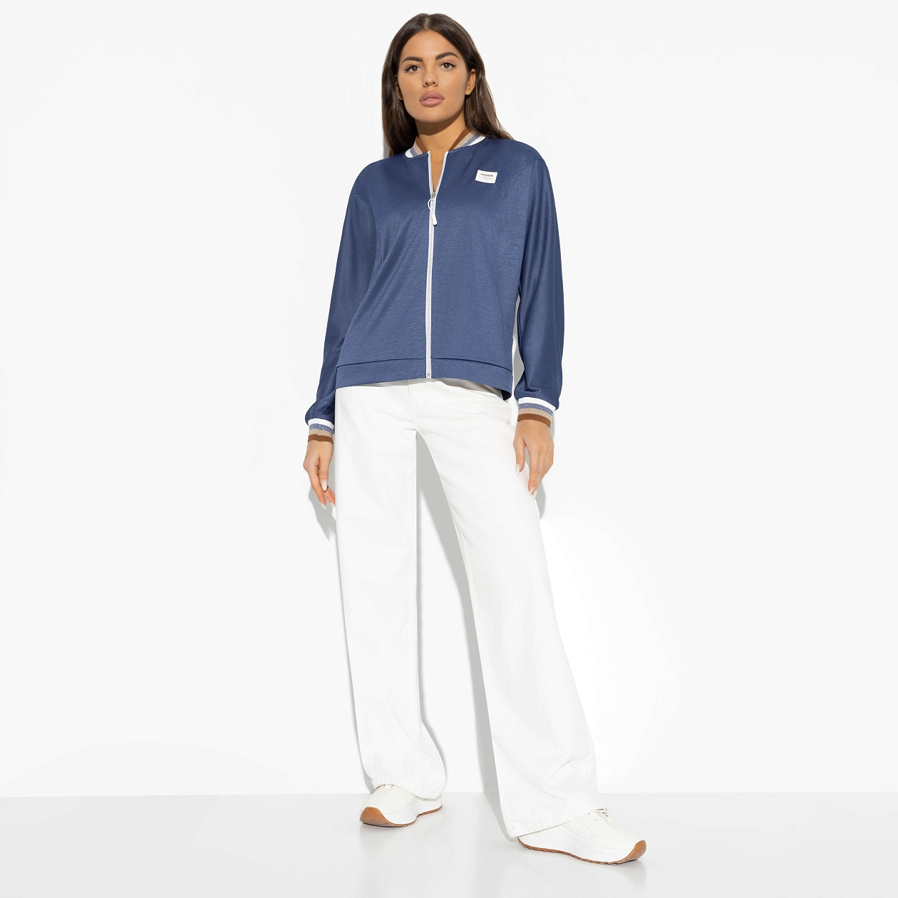 Теннисный турнир в его компании. Он – главный претендент на первое место, ты – его главная болельщица. Драгоценное украшение не только трибун, но и его жизни. Бомбер на молнии из искусственного трикотажа. Акцентные линии воротника и манжетов. Свободная посадка. Классический стиль casual.