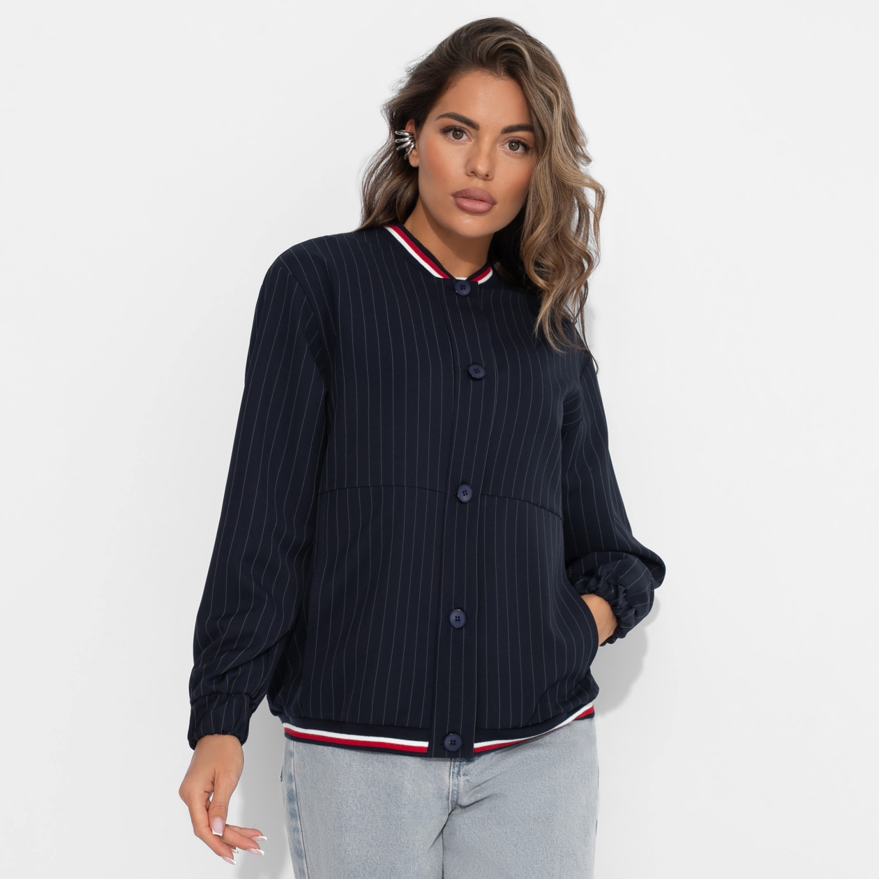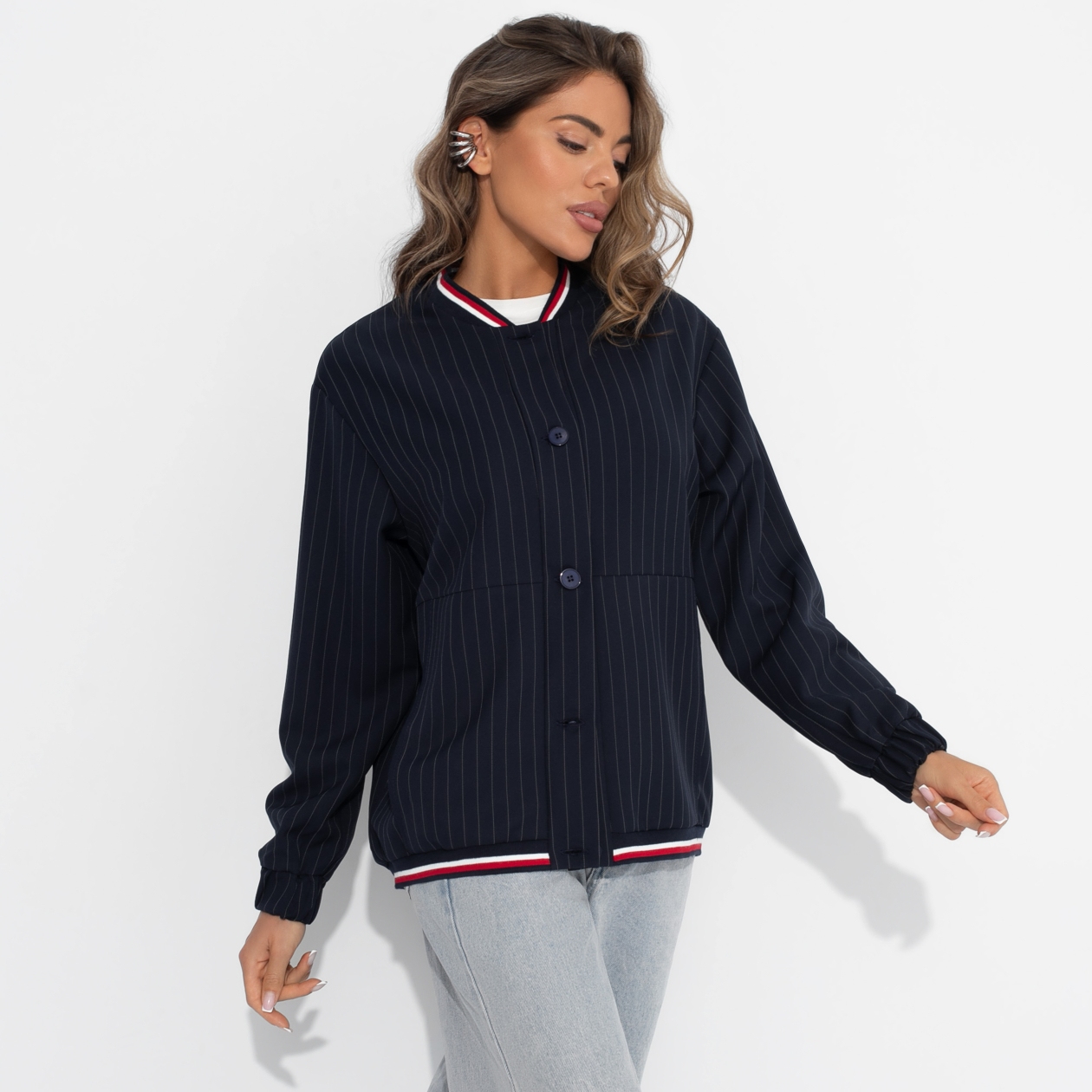 В мире офисного дрессс-кода – он как новый игрок с дерзкой стратегией. Создан для тех, кто умеет командовать и вдохновлять: добавит весомый аргумент к вашей деловой харизме. Бомбер свободного кроя. Материал изделия в тонкую полоску. Застегивается на пуговицы. Есть карманы.