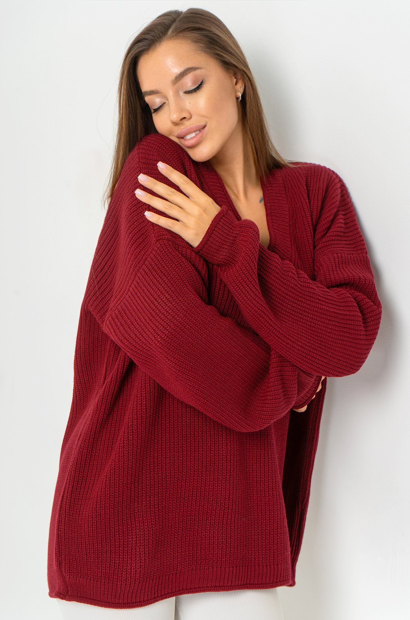 Окутывающий нежностью и заботой бордовый свитер выполнен из акрила и шерсти. Удлиненный силуэт, крой oversize, v-образный вырез, длинные рукава – в этом джемпере для женщин есть все, что поможет оставаться стильной в любой ситуации!