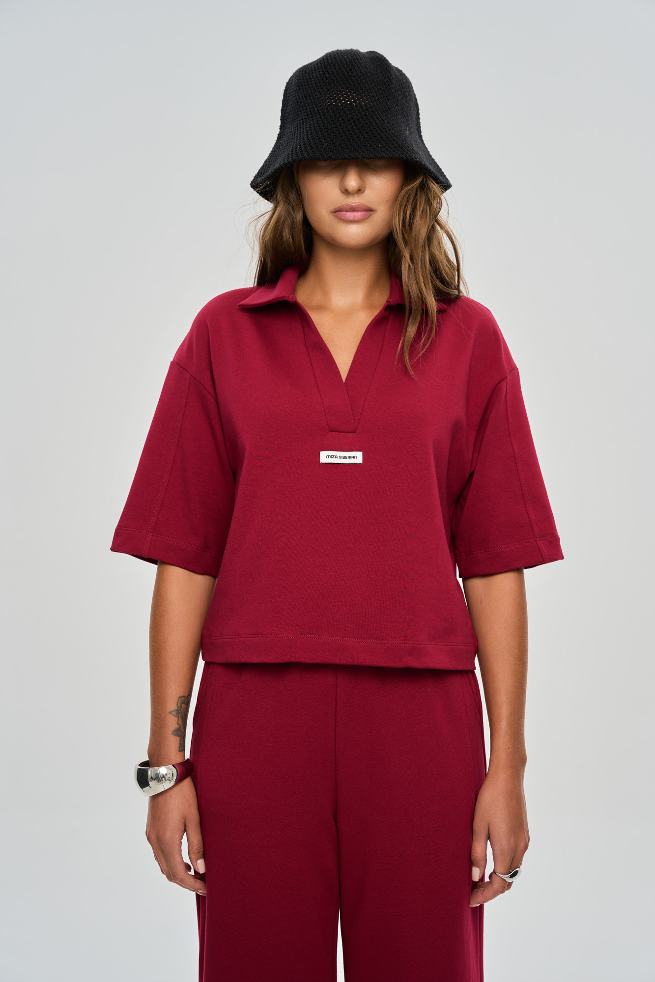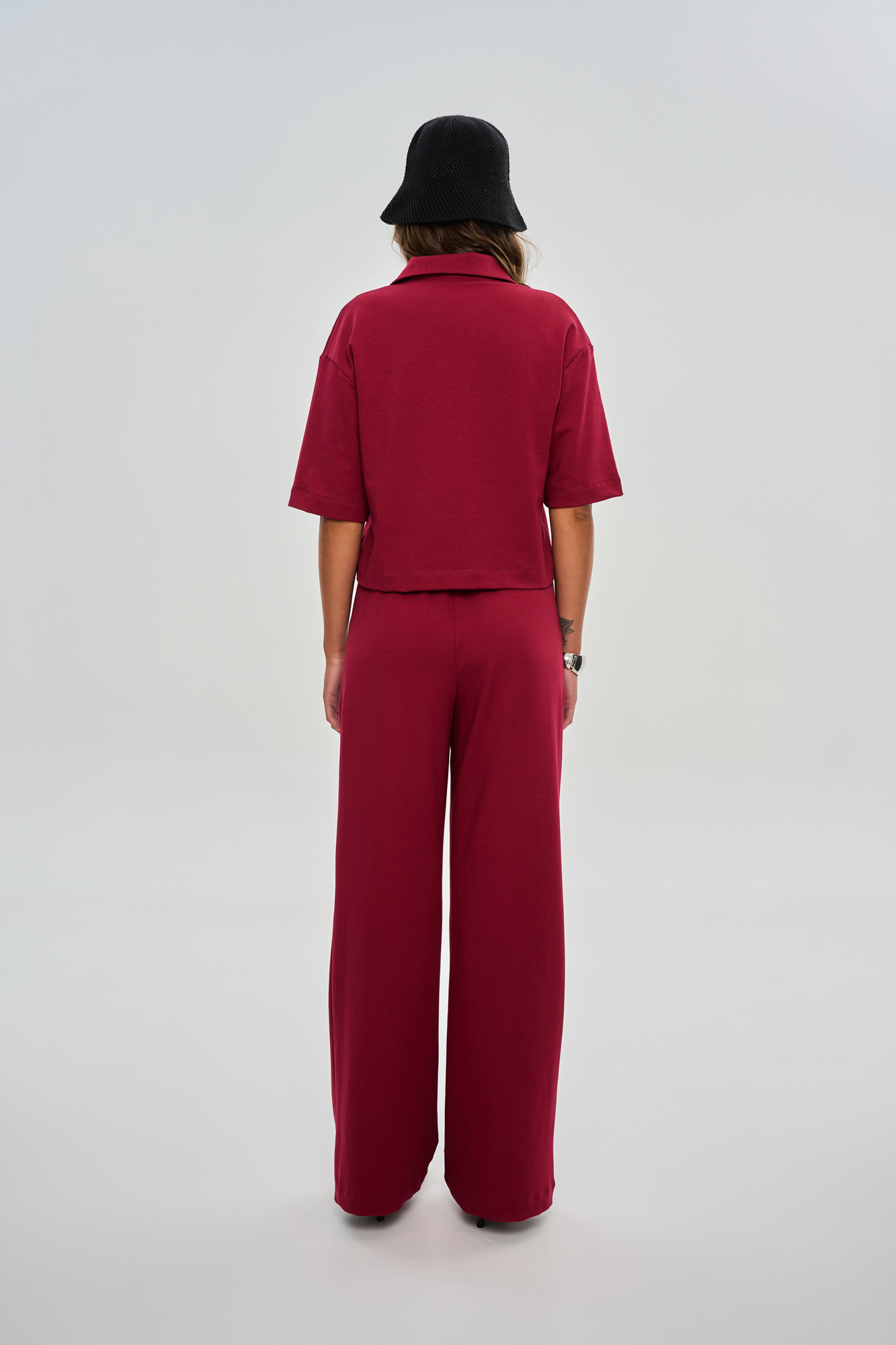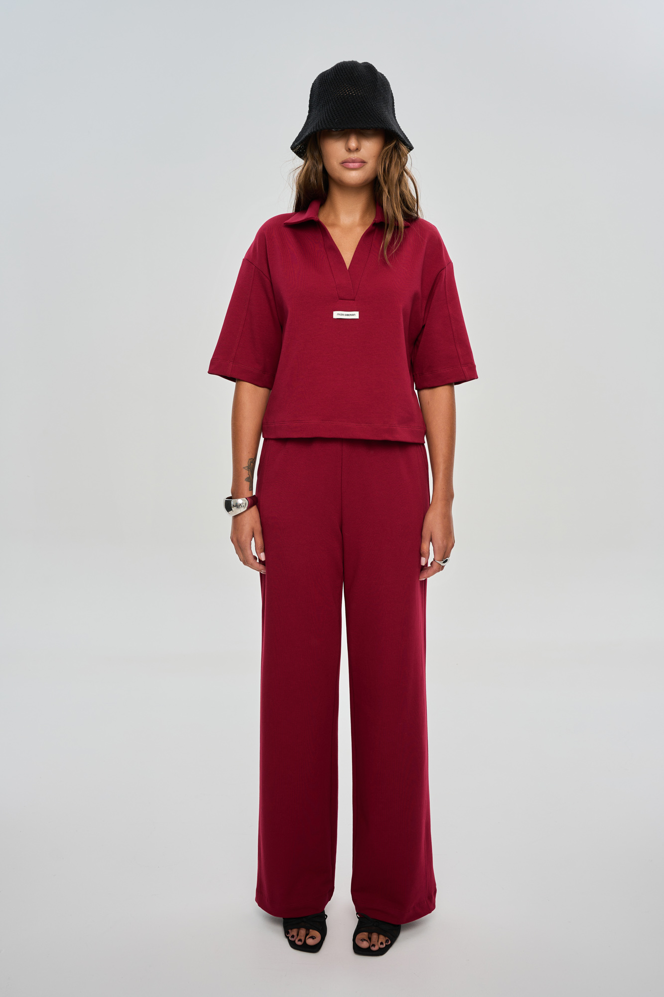 Состоит из укороченного свитшота свободного кроя с воротником и брюк-палаццо с отделочным швом.