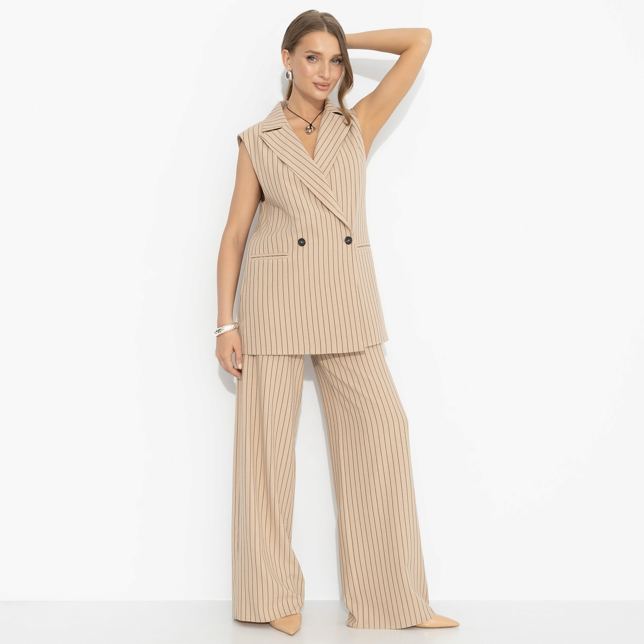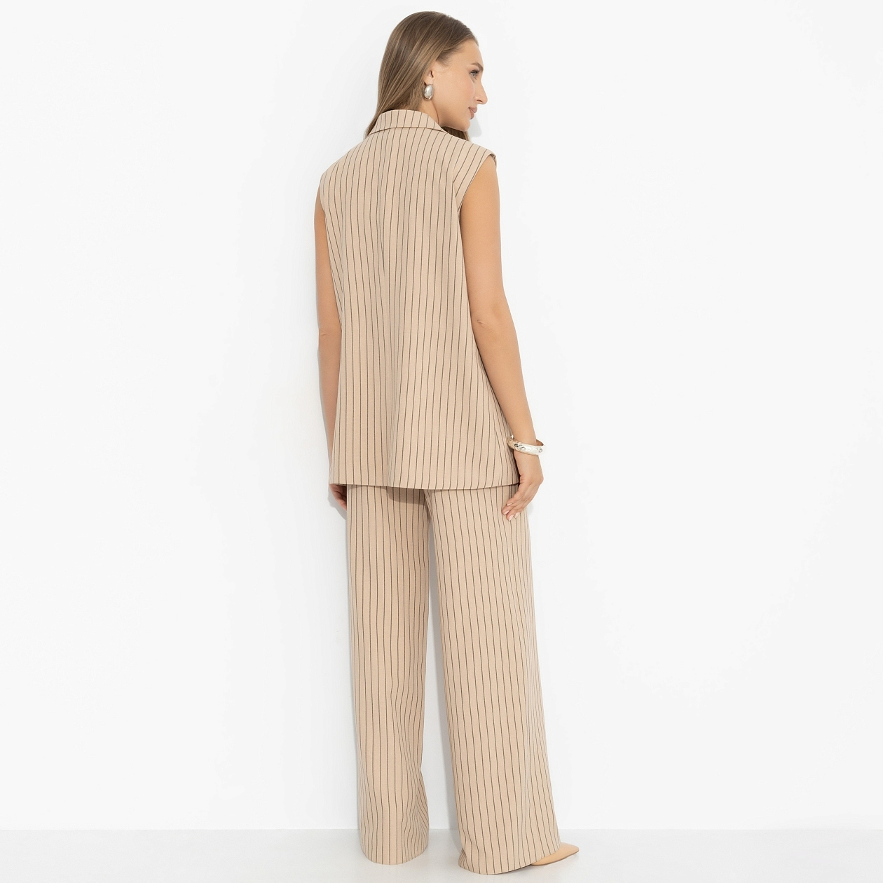 Лето на носу, а задачи никто не отменял. В какой-то момент понимаешь: если уж работать – то красиво. Новый комплект для дней, когда ты не выбираешь между комфортом и собранностью. Полоска, светлый лён и ощущение, будто ты управляешь процессом, а не спасаешься от жары. Жилет собирает верх и задаёт структуру, брюки вытягивают силуэт и добавляют свободы. Комплект работает как единое решение, но легко делится на вещи для разных сценариев.