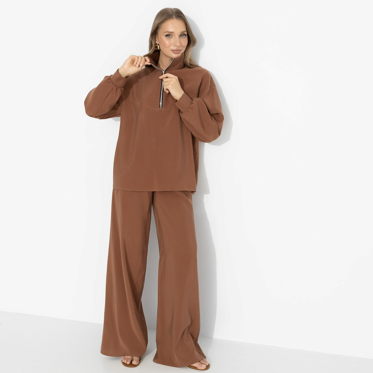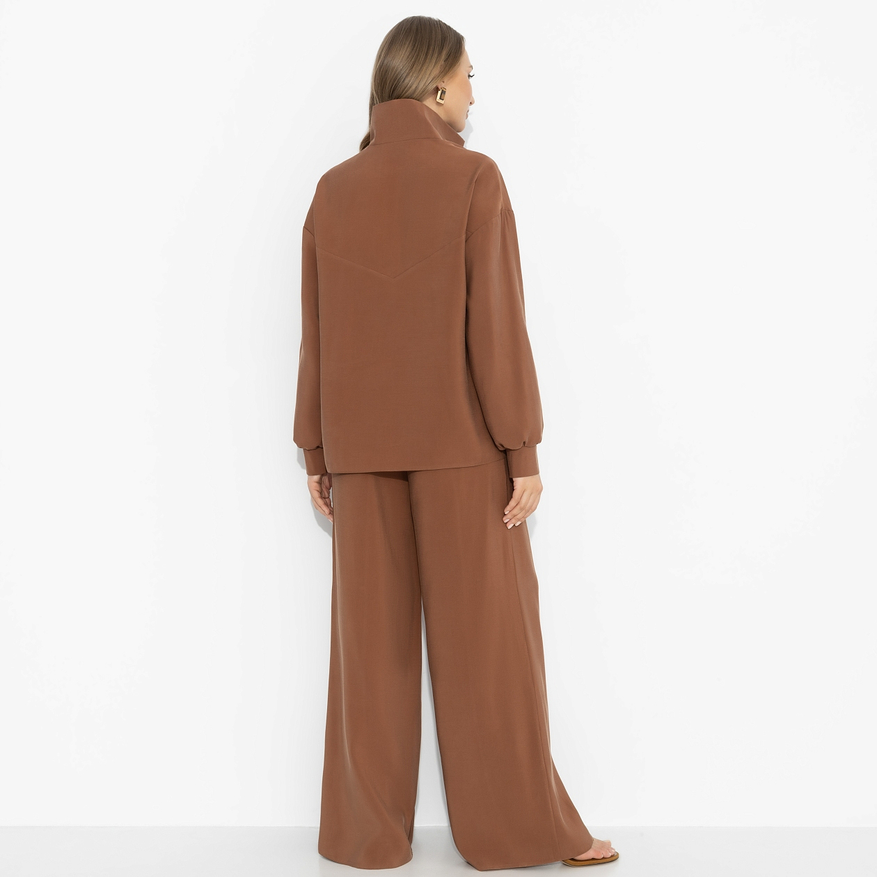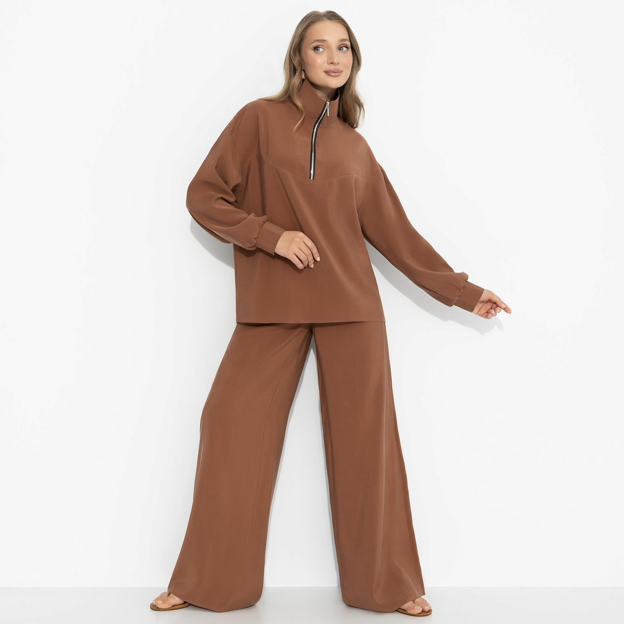 Комфорт – это не компромисс, а новая роскошь. Ты надеваешь этот комплект и понимаешь: не время торопиться, хочется двигаться медленно, красиво. В духе Loro Piana и всей этой эстетики quiet luxury, где главное – как ты себя чувствуешь внутри. Купро даёт мягкость и текучесть, ткань будто скользит по телут. Свободный крой не спорит с фигурой, а создаёт ощущение пространства и уверенности. Верх и низ работают вместе, но легко разделяются – и тогда появляется ещё больше вариантов для жизни.