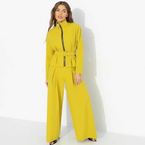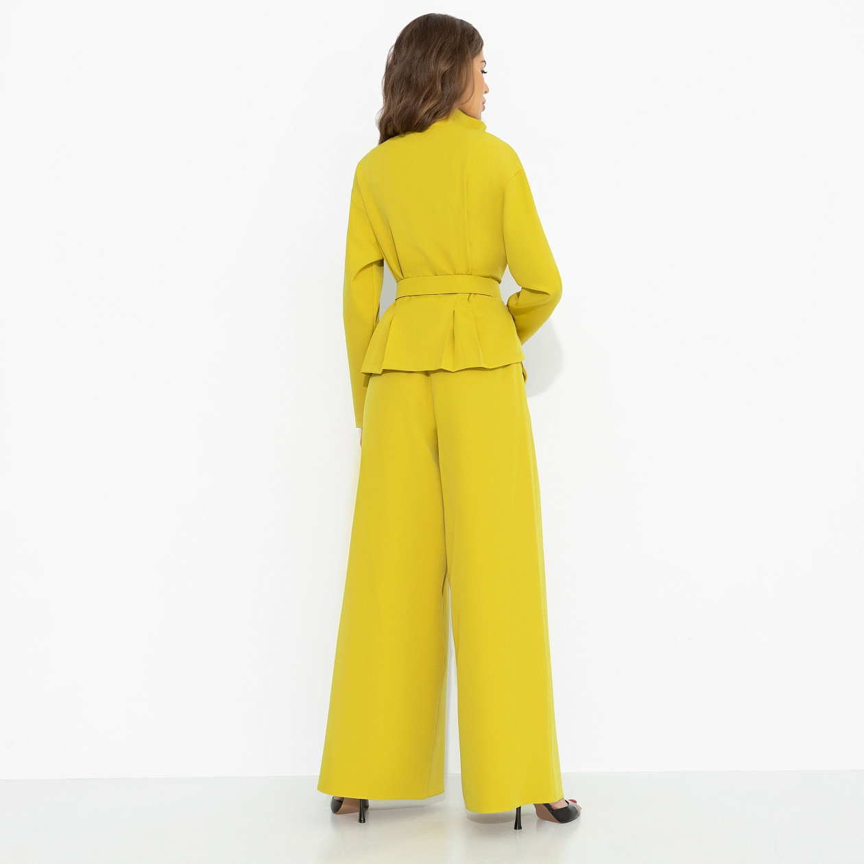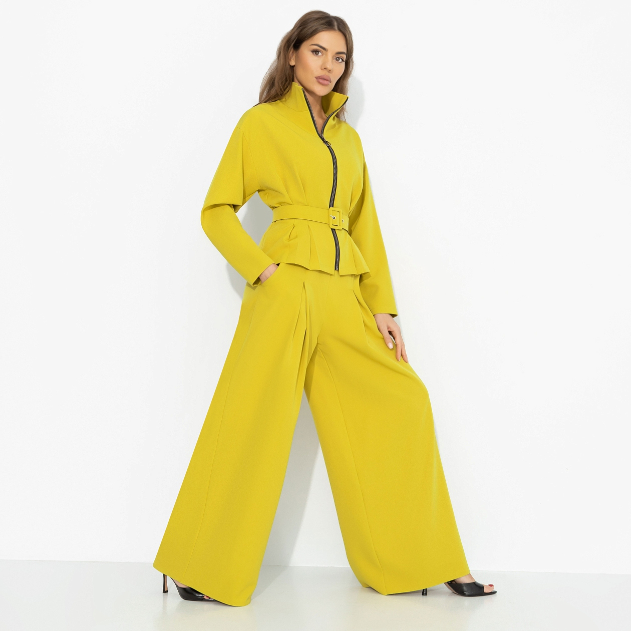 Горчичный цвет как предупреждение. Ты входишь в кадр – и напряжение щёлкает, будто предохранитель. Взгляд острый, шаг точный, и вокруг слишком тихо, чтобы это было случайностью. Эстетика фильмов Тарантино считывается мгновенно: ты не играешь роль – ты и есть главный и уверенный сюжет. Брючный костюм от дизайнеров ЧАРУТТИ собирает фигуру в чёткую, почти графичную форму, Образ для той, кто действует без лишних слов. Сцена твоя.