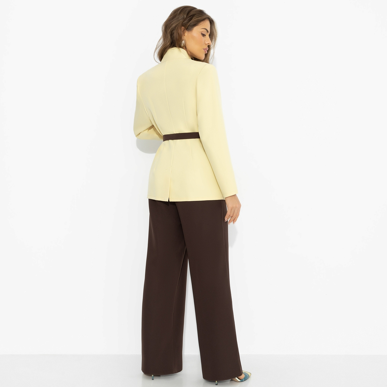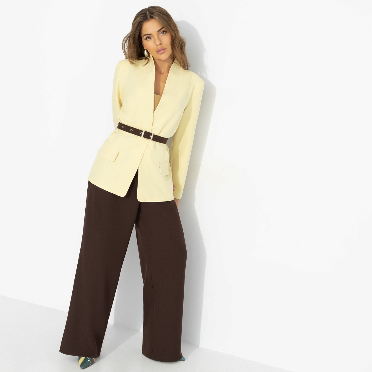 Переводим с дизайнерского на суперстильный: это главный комплект наступающего сезона. Чёткие линии, контрастные настроения, уверенный силуэт – образ звучит как модный манифест новой реальности. В нём легко чувствовать себя на шаг впереди, задавать тон и играть по своим правилам. Комплект уверенно держит форму и выстраивает характер образа: жакет подчёркивает талию, прямые брюки вытягивают силуэт и добавляют графичности. Невозможно не заметить.