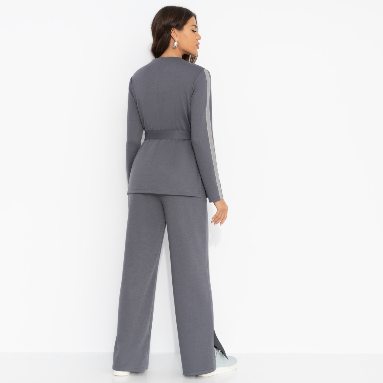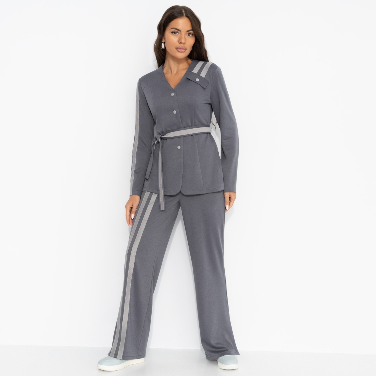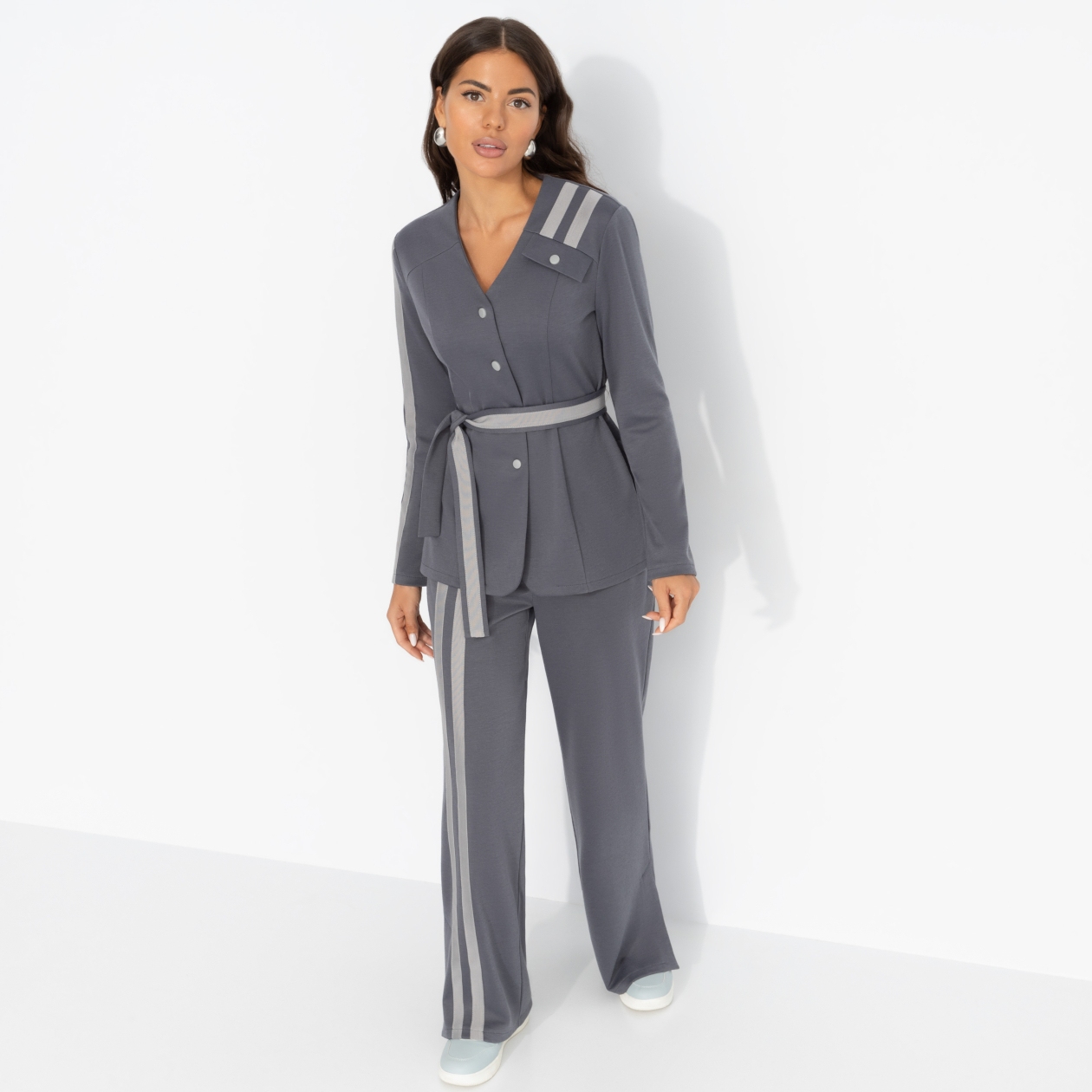 Костюм ЧАРУТТИ – код элегантного превосходства. Не просто серый, а изумительный серый – как любимый город после первого глотка кофе! Займите свое (главное!) место в алгоритмах мегаполиса. Комплект состоит из брюк прямого кроя с контрастными лампасами и жакета. Жакет застегивается на клепки. Есть разрезы по бокам изделия. Брюки с карманами. Пояс на скрытой широкой резинке. Пояс в комплекте.