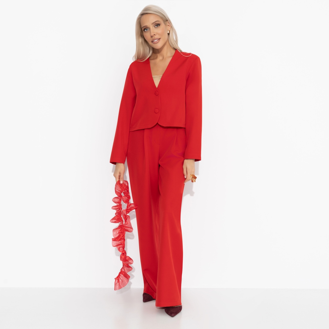 Костюм ЧАРУТТИ – буквально манифест уверенности. Она вошла в зал как героиня собственного успеха, готовая принять поздравления под восхищённые взгляды коллег. Жакет подчёркивает стройность талии и дерзкую элегантность. В образе от ЧАРУТТИ нет места сомнениям — только сила, страсть и безграничный потенциал, облачённый в ткань. Комплект состоит из прямых брюк и укороченного жакета. Ворот жакета оформлен акцентным декором в виде сборок из органзы. Сборка съемная! Жакет застегивается на пуговицы. Брюки с деликатными защипами. Посадка на талии. Застегиваются на молнию и пуговицу. Есть шлевки.