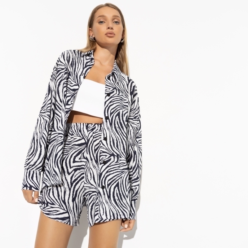 Его мечтой было носить рубашку с шортами в трендовой расцветке «зебра», но исполнилось она у тебя. Так распорядилась сама Госпожа Мода. Ничего с этим не поделать, остается подчиниться. Его задача – любоваться тобой. В составе комплекта шорты с высокой посадкой на резинке. Рубашка свободного кроя на пуговицах. Комплект из 100% вискозы.