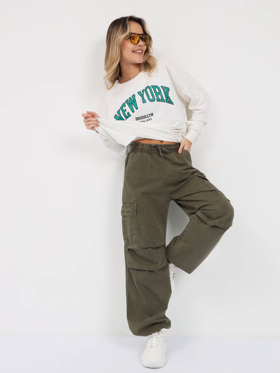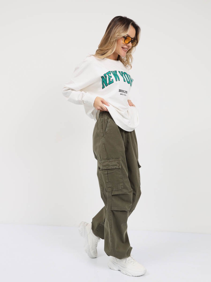 Женские модные брюки карго-парашюты. Посадка Loose fit (широкие по бедру), прямые, широкие штанины по всей длине. Для получения дополнительного объема спереди в области колена сделаны две складки. Высокая посадка по талии, пояс на эластичной резинке со шнуром. Без застежки по гульфику. Брюки имеют боковые косые карманы, по бокам накладные карманы с клапаном. По низу штанин вставлена круглая шляпная резинка, которую с помощью фиксатора можно затянуть и получить стиль брюк "парашюты". Выполнены из мягкой ткани gabardine. Крашение Garment dayed , т.е. брюки покрашены в  готовом виде после пошива. Параметры указаны для размера S. Длина шагового шва - 81,0 см. 100%Хлопок