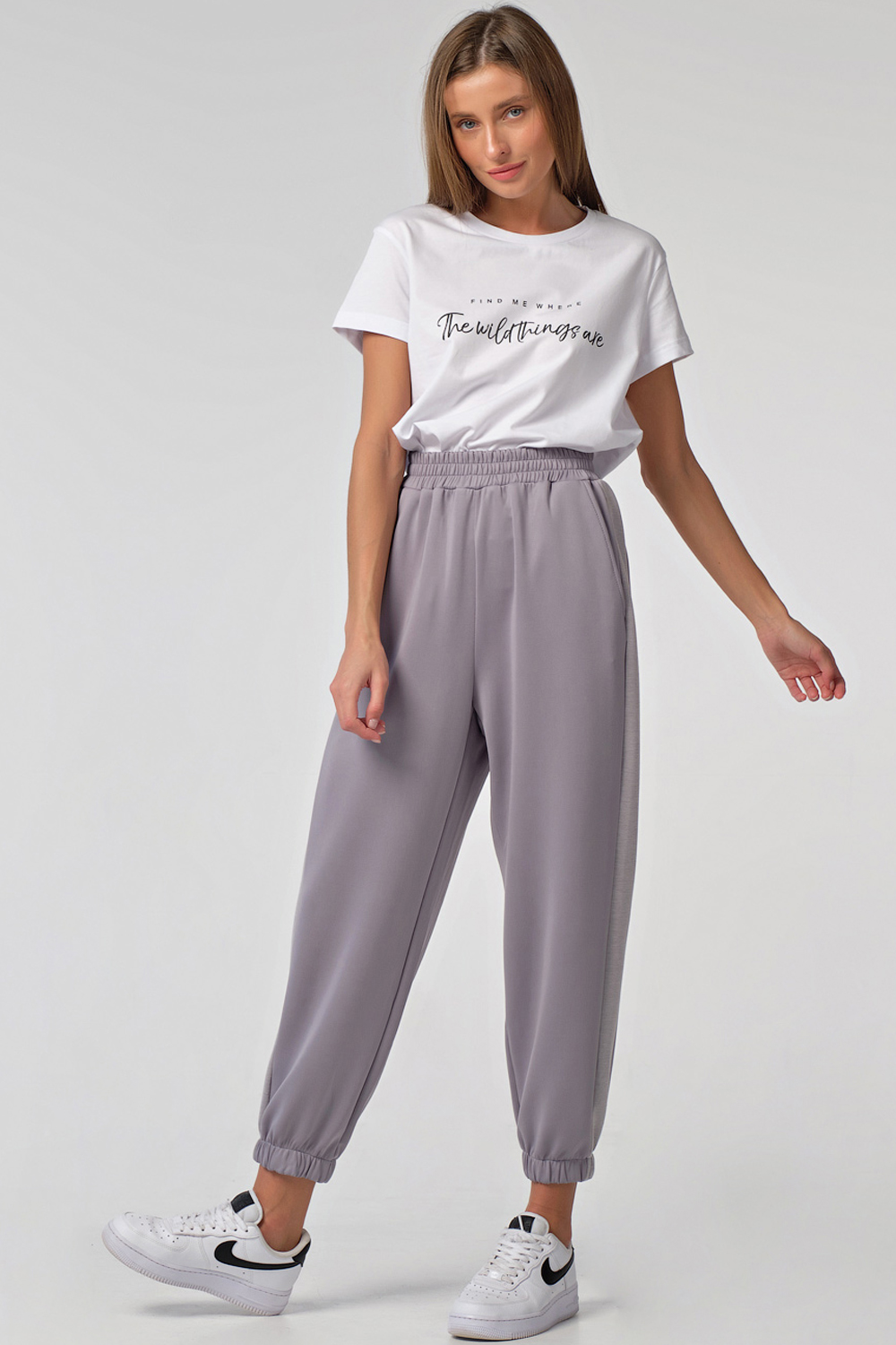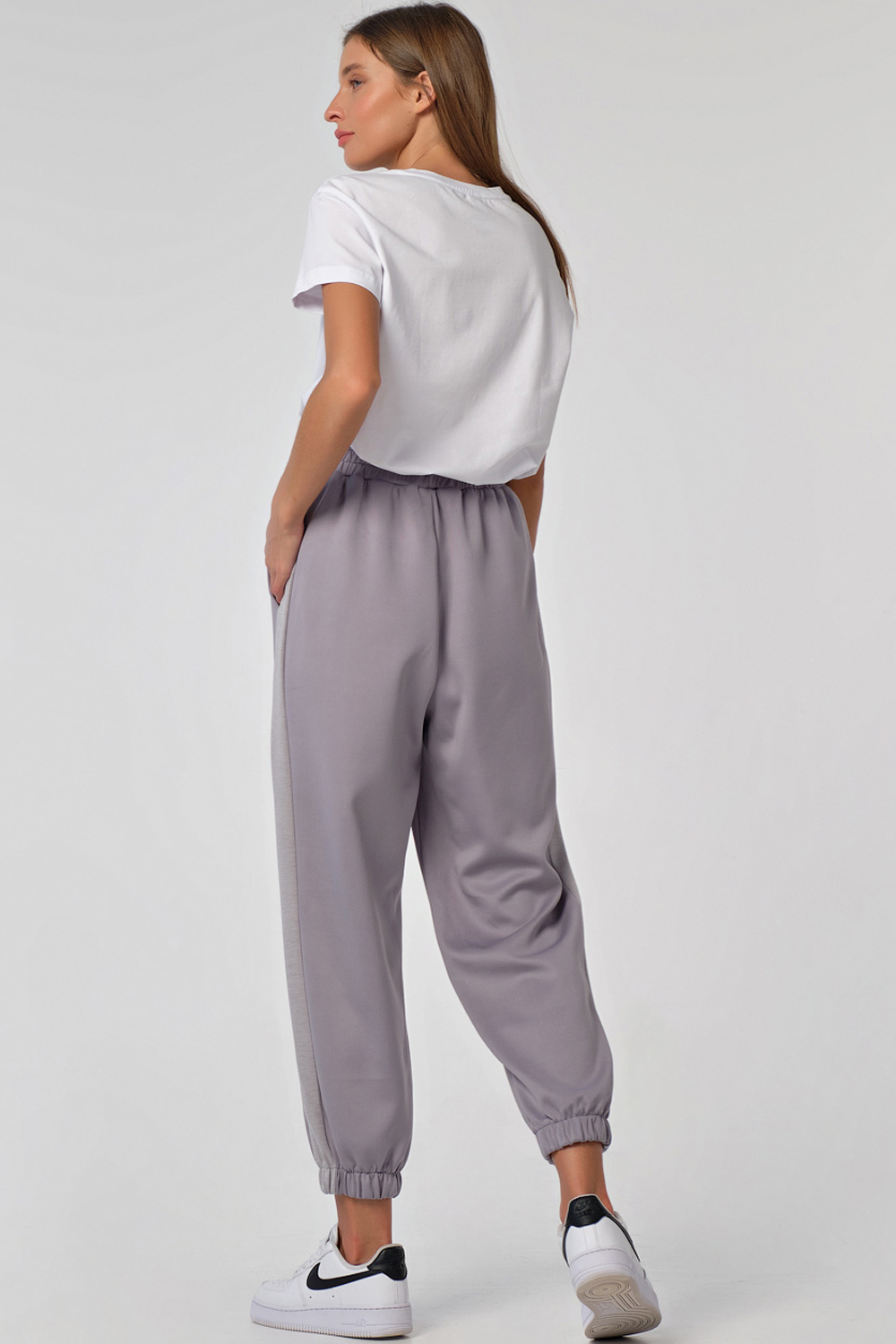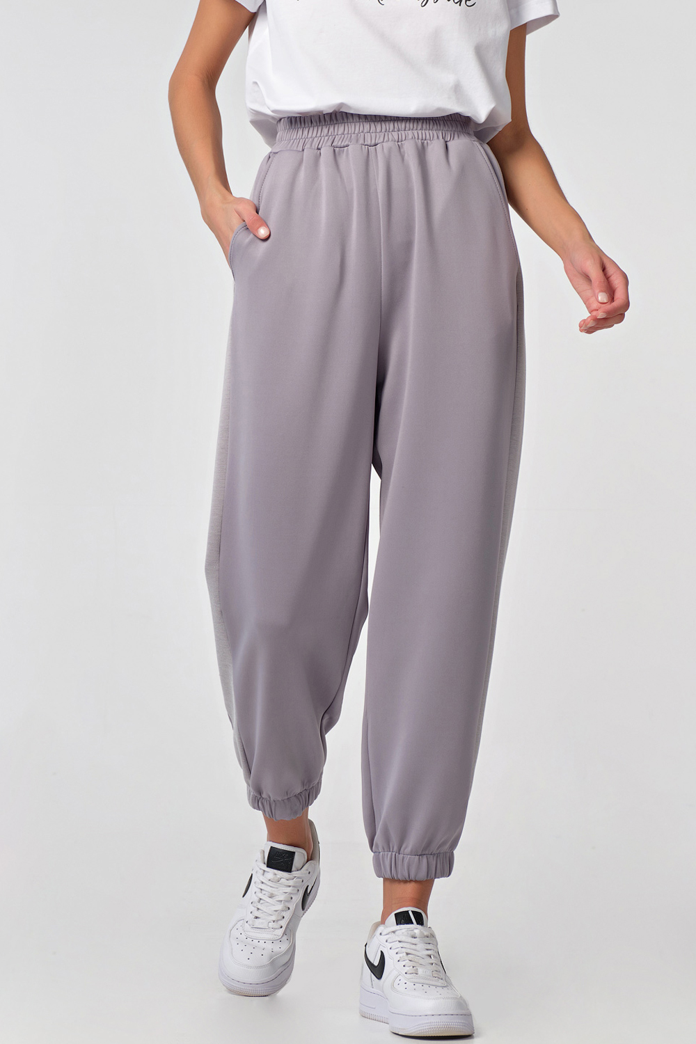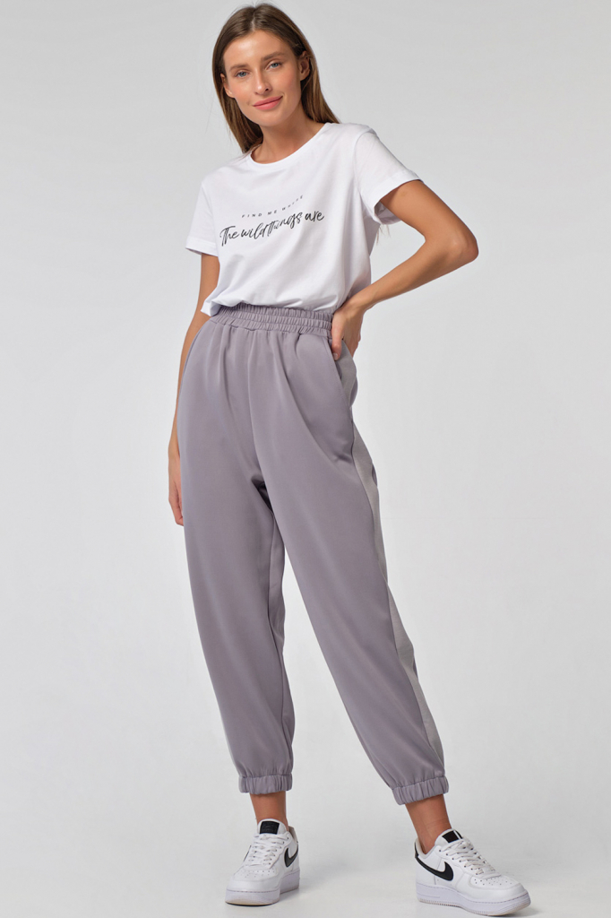 • Особенности: брюки свободного силуэта из плотного трикотажа. Детали: притачной пояс с резинкой, лампас по боковому шву, боковые карманы, низ брюк собран на резинку.