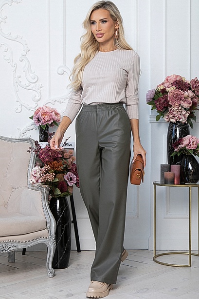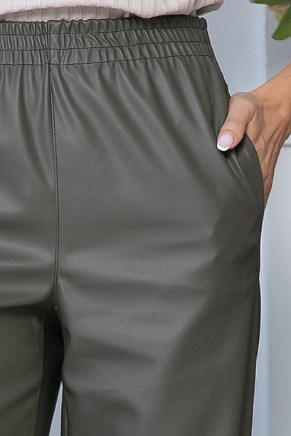 Комфортные брюки прямого,свободного силуэта из экокожи.В боковых швах функциональные карманы,удобную посадку по талии обеспечивает эластичный пояс на резинке.