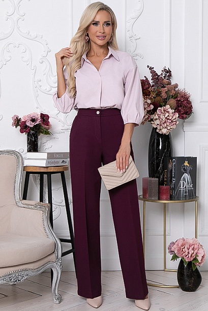 * Брюки из плотного хорошо держащего форму жаккардового трикотажного полотна  с заутюженными стрелками.Брюки с высокой посадкой по талии  застегивающиеся на молнию в гульфике.Пояс притачной с застежкой на пуговицу.Для удобства в носке пояс по спинке собран на резину.По бокам подрезные функциональные карманы.