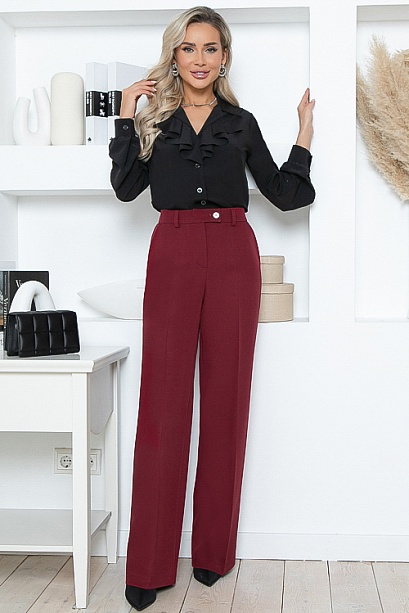 Брюки из костюмной ткани прямого силуэта  с высокой посадкой по талии и  заутюженными стрелками.По центру застежка гульфик-молния.Пояс притачной застегивающийся  на пуговицу.Для удобства в носке пояс по спинке собран на резину.В боковых швах расположены функциональные карманы с отрезным бочком.По поясу настрочены шлевки.