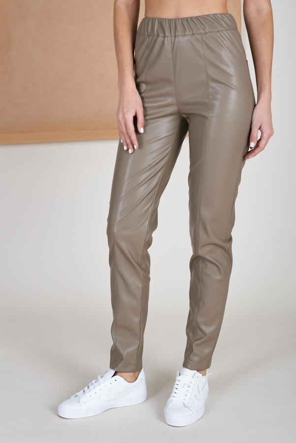 Брюки из эластичного полотна, с покрытием, имитирующим кожу, чуть зауженные книзу. По центру передней части брючин выполнен шов с декоративной строчкой. На задней части брюк накладные карманы. Пояс с эластичной резиной.