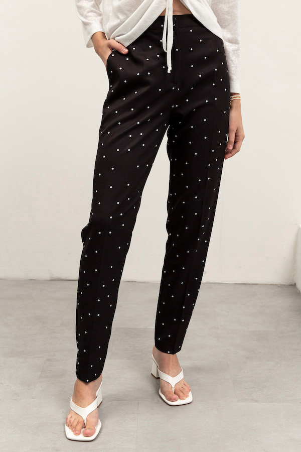 Брюки прямого силуэта, зауженные книзу из костюмной ткани. Застёжка на молнию-гульфик и пуговицу. Карманы с подкройным бочком. Притачной пояс со шлёвками.