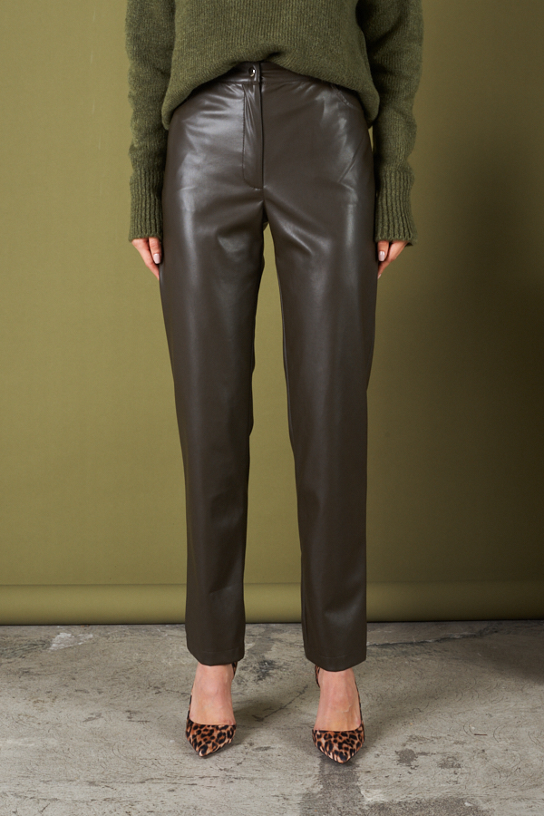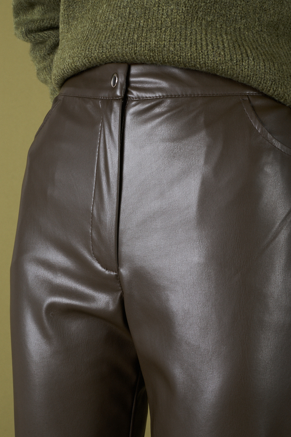 Брюки из эластичного полотна, с покрытием, имитирующим кожу, зауженные книзу. На передней части брюк карманы с подкройным бочком. Притачной пояс, застёжка на металлическую молнию-гульфик и кнопку.