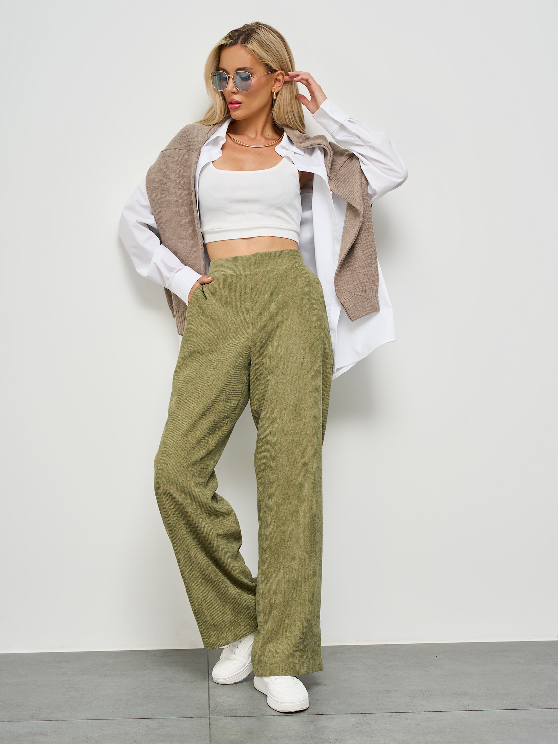 Прямые брюки  с карманами. Сзади пояс на резинке.