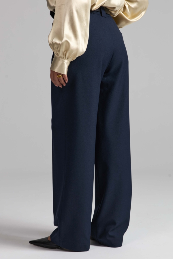 Брюки прямые широкие со стрелками, пояс на резинке, застежка на молнию и пуговицы, с боковыми карманами.