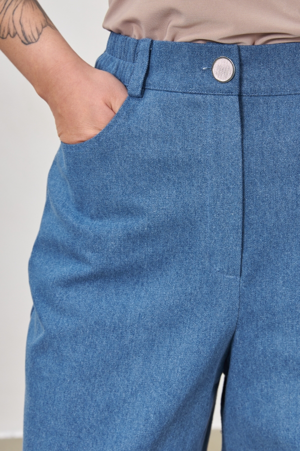 Широкие брюки из премиум денима. По спинке резинка, кокетка, накладные карманы.