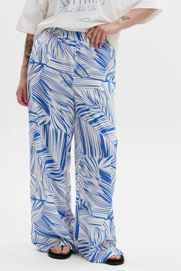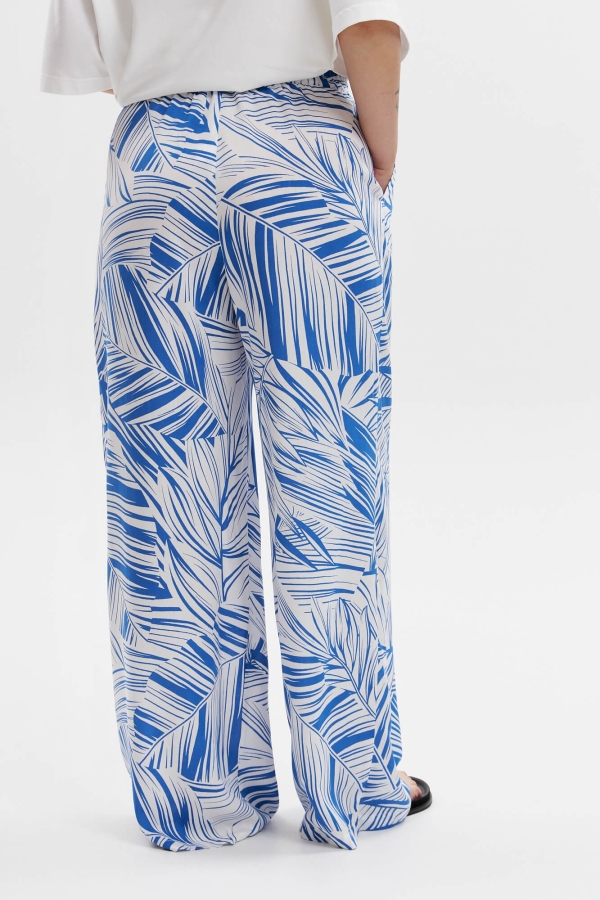 Брюки широкие с поясом на резинке и завязками. По переду боковые карманы.