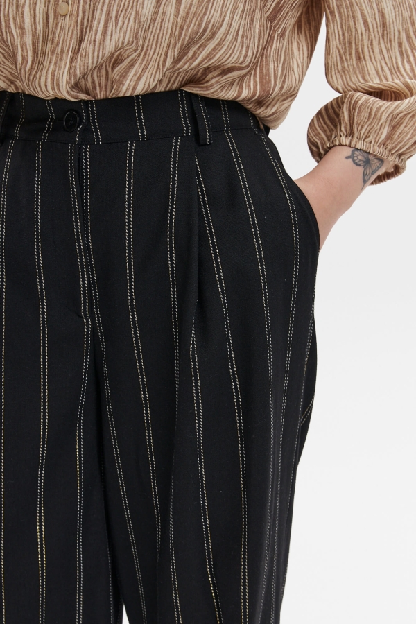 Брюки широкие с поясом на резинке и завязками. По переду боковые карманы. В составе полотна присутствует декоративная металл. нить.