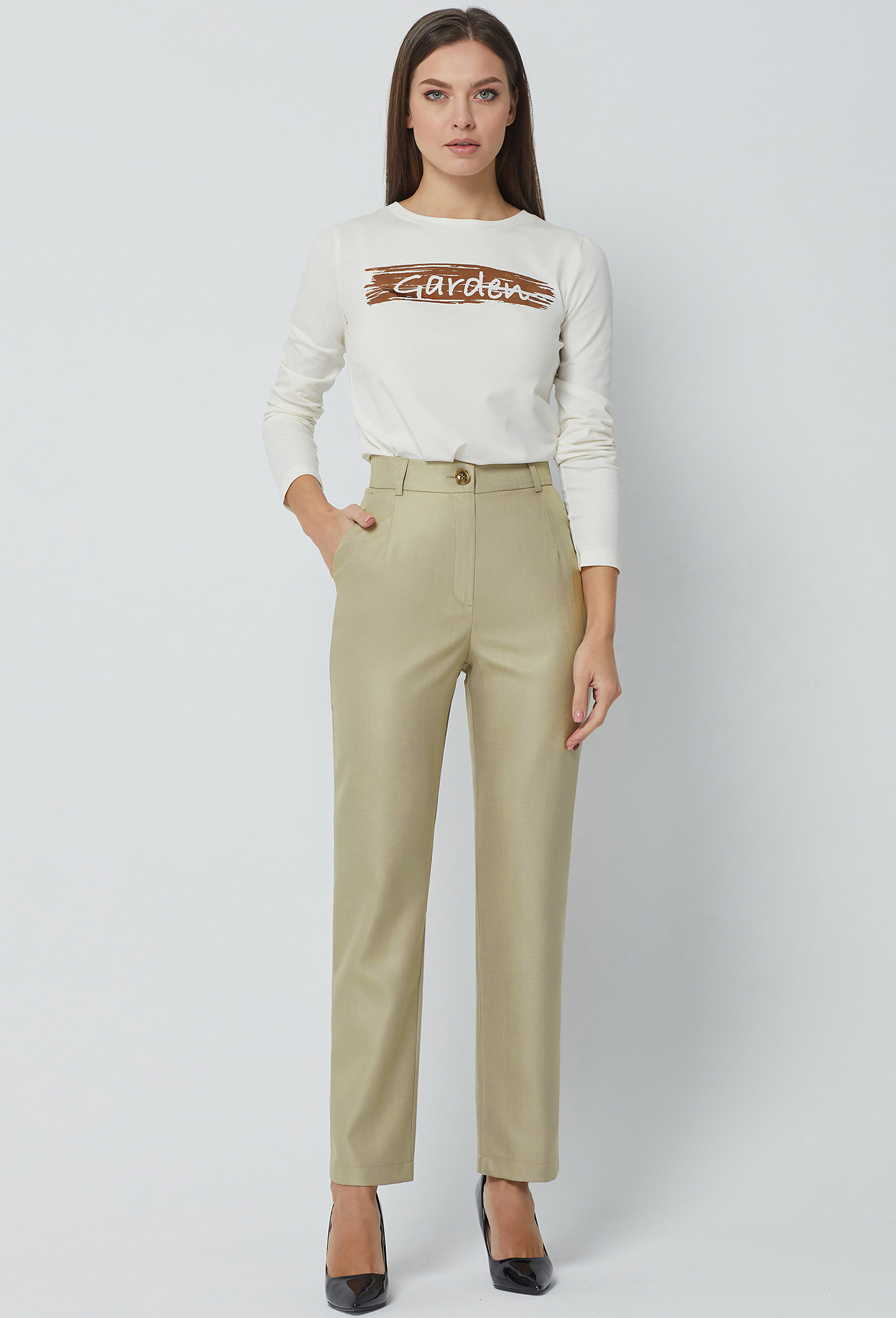 Модель: Базалини 3845-3673 песочный <..показатьli>Рост: 164-170 см (рост модели на фото 170см) Сезон: Круглогодичный Тип ткани: Полиэстер- 65%, Вискоза- 32% , Эластан- 3%Брюки на притачном поясе со шлёвками с застёжкой на молнию и две петли-пуговицы, передние части с косыми карманами, задняя правая часть с карманом-обманкой с рамками.Ткань - "хамелеон", в зависимости от освещения может менять свой цвет от светло-бежевого до песочного. Это нужно видеть, на фото не передать.   Длина брюк: 44р - 101см, в 52р - 103см. li>Рост: 164-170 см (рост модели на фото 170см) Сезон: Круглогодичный Тип ткани: Полиэстер- 65%, Вискоза- 32% , Эластан- 3%