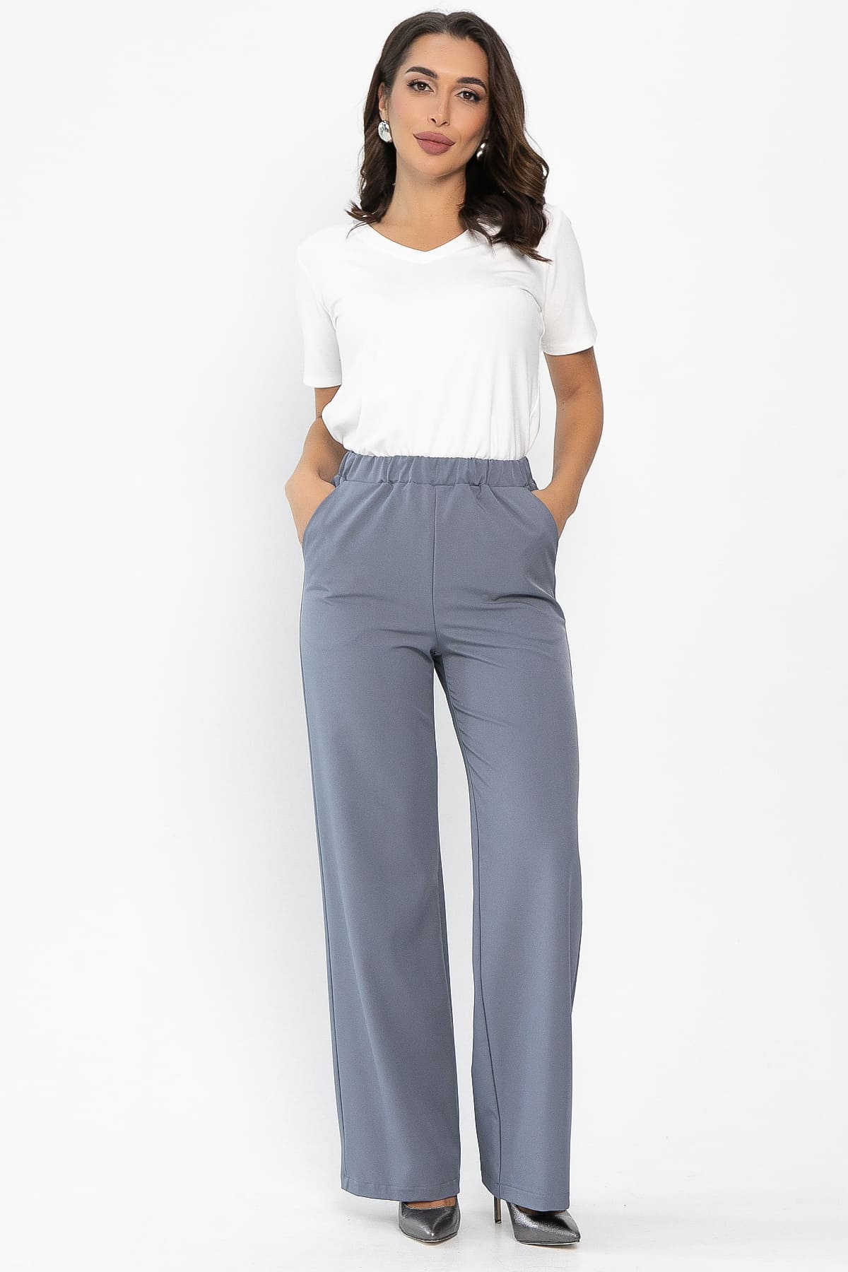 Классические брюки в серо-голубом цвете на резинке по талии подойдут для офисного и повседневного образа. Они не сковывают движений и выглядят стильно и лаконично. В боковых швах брюк есть удобные карманы. Универсальная длина. Брюки отлично смотрятся в сочетании с классическими рубашками или блузами, а также подойдут для создания расслабленного образа.