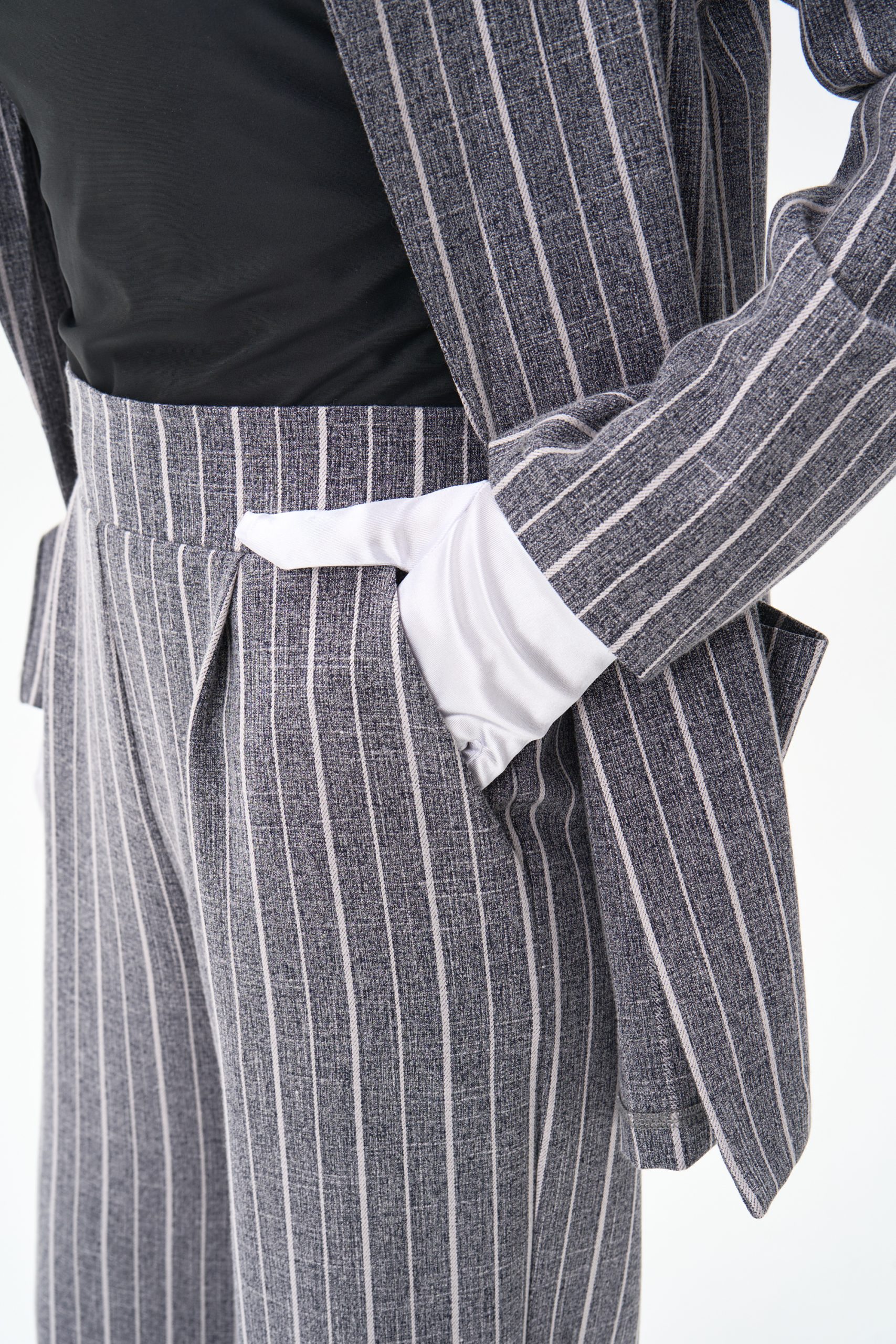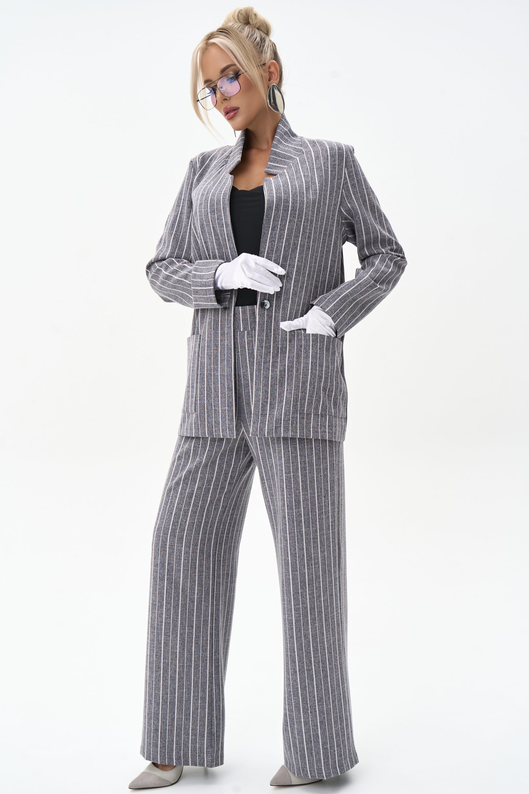 Брюки в полоску — это свобода движения и чистые линии одновременно. Прямой крой и слегка удлинённая длина визуально удлиняют ноги и делают образ гармоничным. Они легко сочетаются с пиджаком “Грей”  из комплекта или любым другим верхом, позволяя создать как деловой, так и более расслабленный городской look.