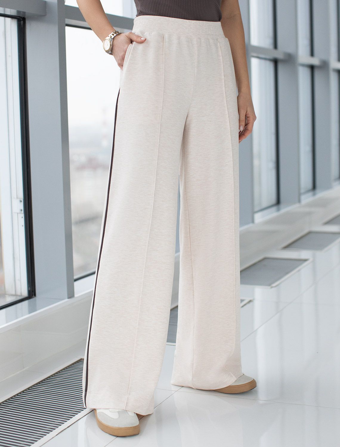 Брюки выполнены из эластичного футера двухнитки. Изделие свободного кроя дополнено трендовыми лампасами кофейного цвета и боковыми карманами. Эластичный пояс на резинке с потайным шнуром. Модель сочетается в костюме с джемпером D49.086