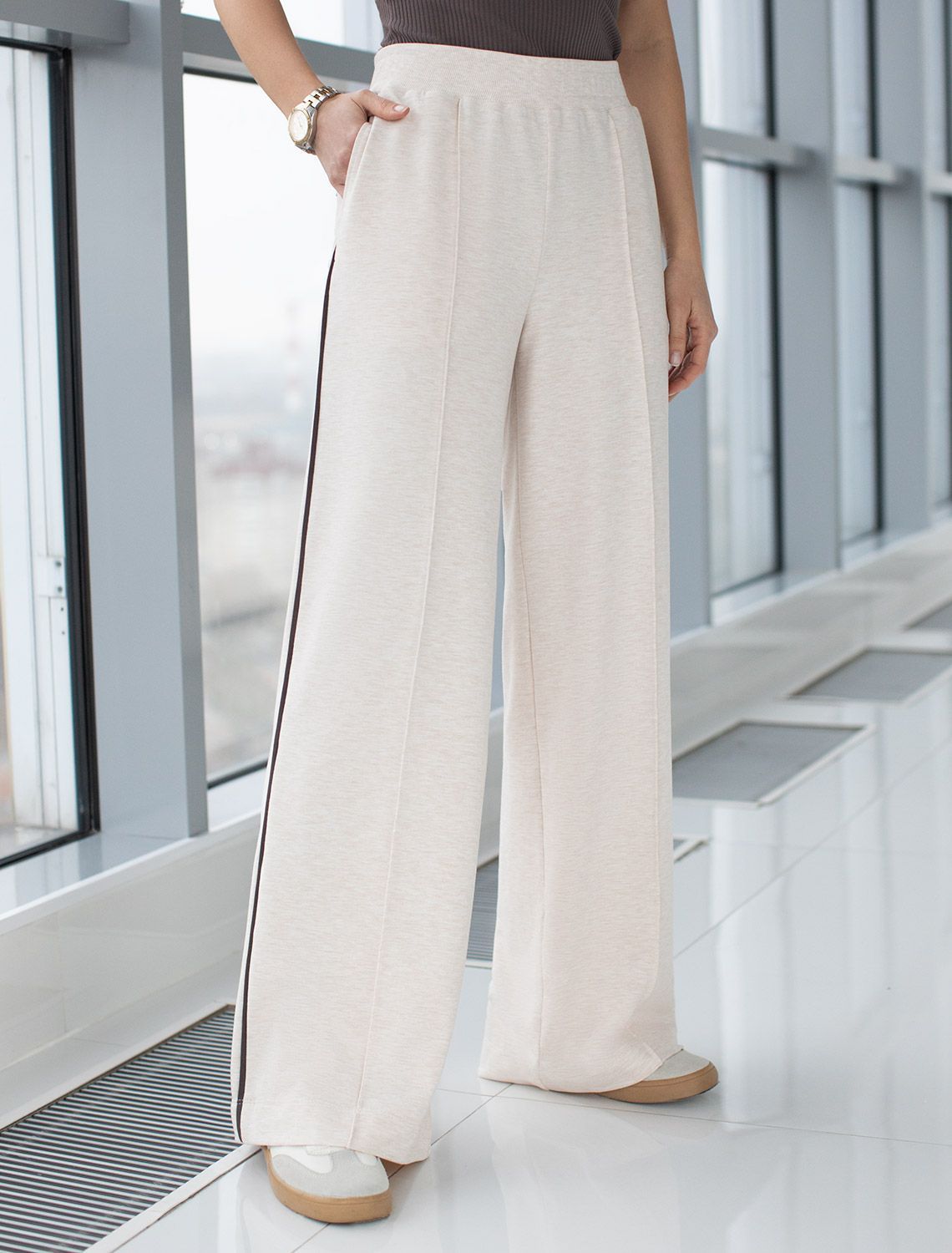 Брюки выполнены из эластичного футера двухнитки. Изделие свободного кроя дополнено трендовыми лампасами кофейного цвета и боковыми карманами. Эластичный пояс на резинке с потайным шнуром.
