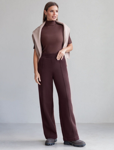 Свободные брюки из трикотажного костюмного полотна. Эластичный пояс на резинке с регулируемым шнурком из эко-кожи комфортно фиксирует изделие на талии. Модель дополнена двумя боковыми и задним карманами. 66%Вис 25%ПА 9%ПУ