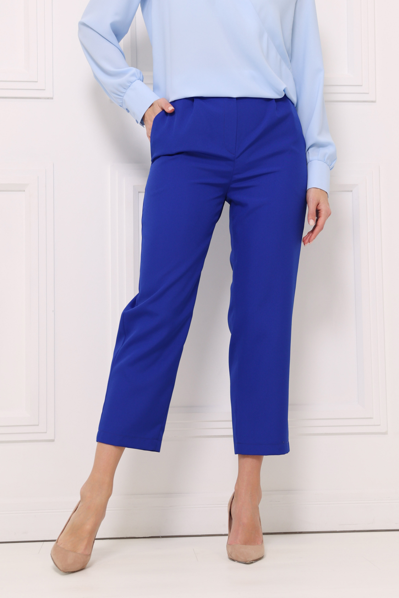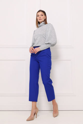 Брюки- капри прямого кроя. Приточной пояс с резинкой со стороны спинки. Карманы в боковых швах. Застежка на молнию и пуговицу.