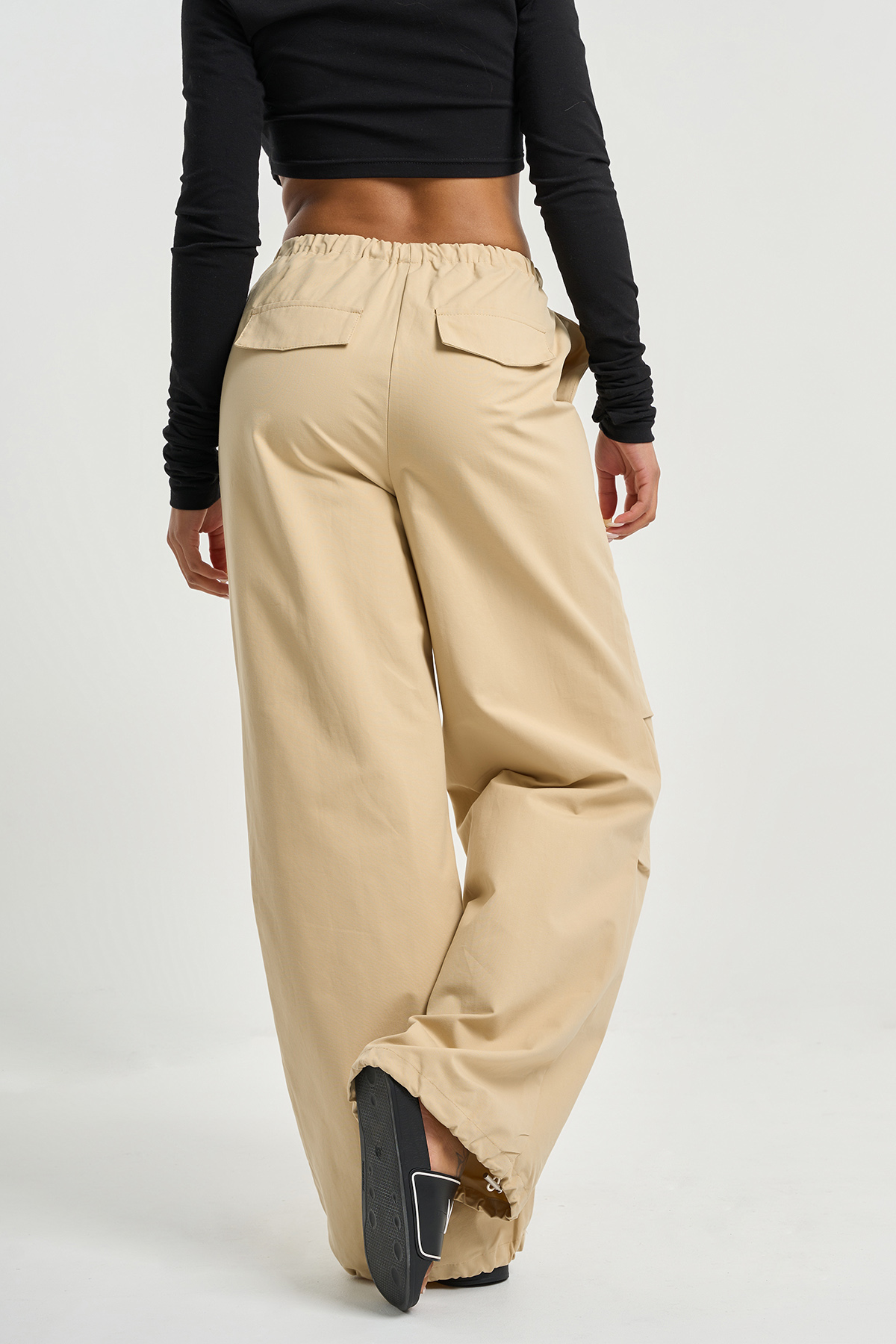 • Особенности: Брюки прямого силуэта из плотной хлопковой ткани. Детали: цельнокроенный пояс со сборкой на резину, люверсы и шляпная резинка с регуляторами в кулисе пояса, карманы в боковых швах, двойные защипы по линии колена, кулиска по низу штанины с утяжкой на шляпную резину. Без застежки.
