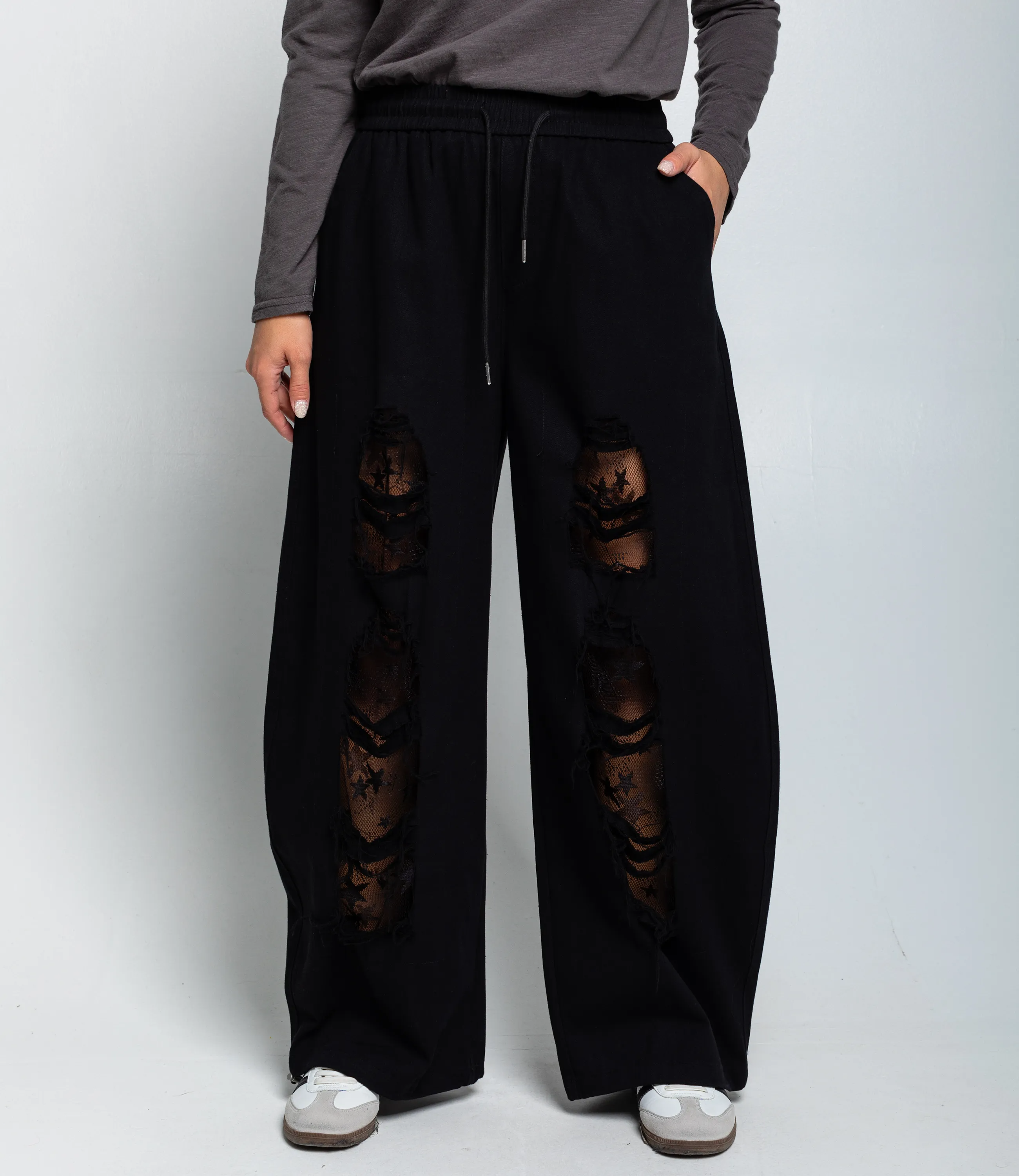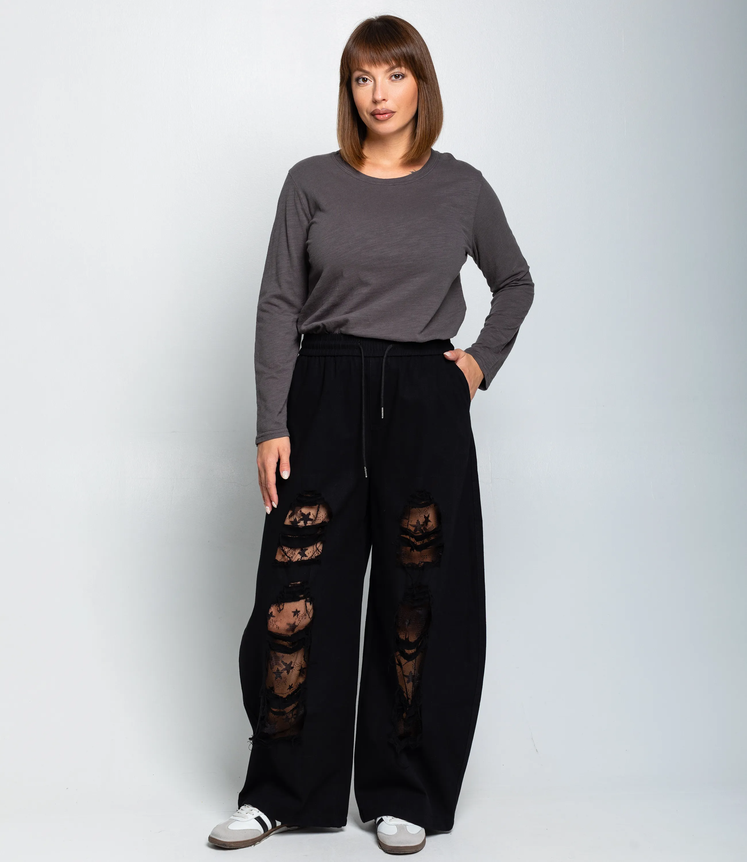 Брюки — это часть гардероба, которая подчёркивает уникальность и стиль каждой покупательницы. Модель выполнена в свободном широком крое с эластичным поясом и утягивающим шнурком, что обеспечивает комфортную посадку и универсальность при выборе размеров. Декоративной особенностью являются крупные рваные отверстия на передней части, под которыми видна прозрачная сетка с узором в виде звёзд — такой акцент придаёт изделию оригинальный, модный характер и вписывается в городские повседневные и гранж‑образы. Брюки оснащены боковыми карманами, что повышает их практичность в повседневной носке. Для пошива использована ткань 80% хлопок, 20% полиэстер: хлопок обеспечивает комфорт, приятные тактильные ощущения и хорошую воздухопроницаемость, полиэстер добавляет прочности, уменьшает усадку и помогает сохранять форму при активной носке и стирках. Комбинация материалов делает модель долговечной и презентабельной даже при интенсивной эксплуатации, что снижает процент рекламаций и возвратов. Для оптовых покупателей это привлекательная и оборотистая позиция: актуальный дизайн и универсальный крой упрощают формирование размерного ряда, а выразительные декоративные элементы повышают привлекательность товара на витрине. Рекомендуем включать модель в тематические подборки «streetwear» и «casual», комбинировать с базовыми футболками, худи и куртками для увеличения среднего чека, предлагать наборы ключевых размеров и наборы оттенков для ускорения оборачиваемости. Цвета и фактура соответствуют фотографиям в карточке товара; на странице размещена подробная таблица размеров для точного подбора.