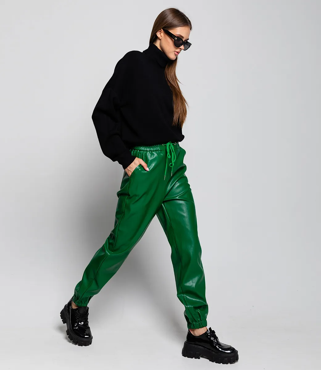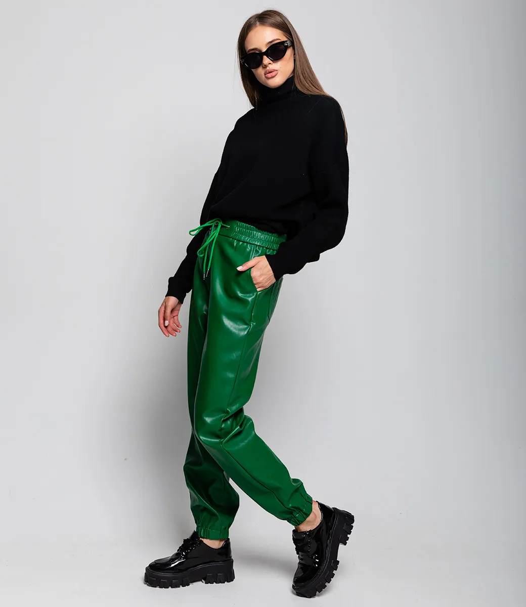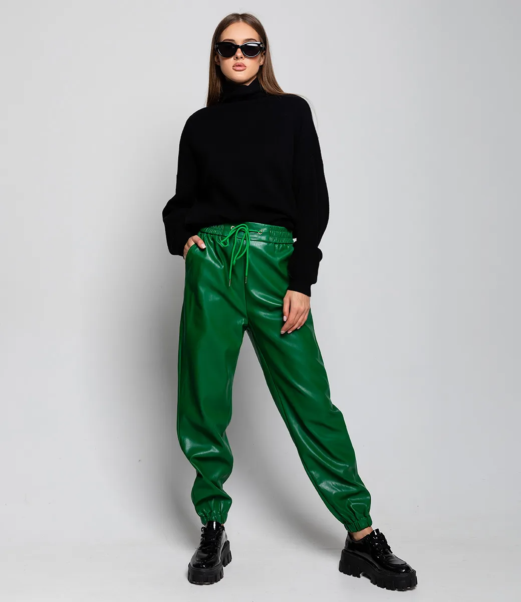 Брюки джоггеры из эко-кожи добавят в образ дерзости. Супермодная можель представленна в нескольких цветах, благодаря чему можно разнообразить свой гардероб под любой образ.